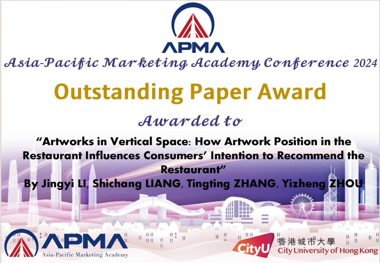 5月10日至12日,第二届亚太营销国际学术会议(APMA 2024)在香港城市大学召开。2138CC太阳集团梁世昌副教授指导的2022级硕士研究生李静益、张婷婷的论文《垂直空间中的艺术品:餐厅中艺术品的位置如何影响消费者推荐餐厅的意向》(Artworks in Vertical Space: How Artwork Position in the Restaurant Influences Consumers' Intention to Recommend the Restaurant)获杰出论文奖。李静益、张婷婷作为研究生代表参加了会议。