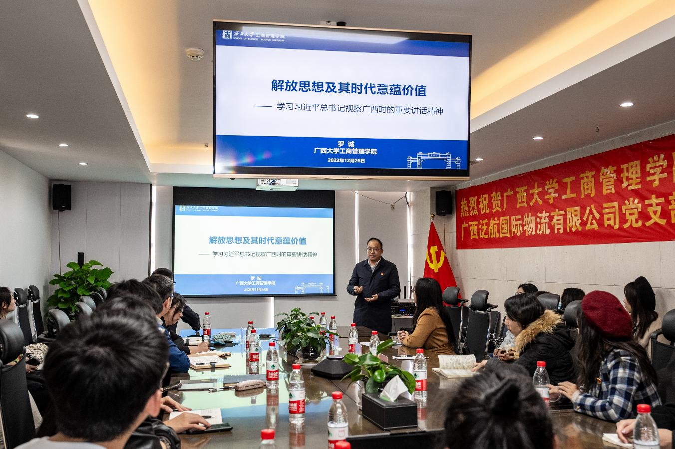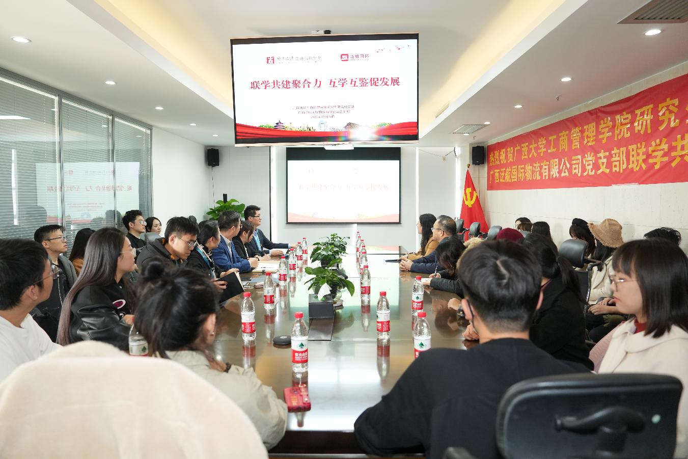 为深入学习习近平总书记视察广西时的重要讲话精神,深化产教融合,推动校企党建联动共建发展,12月26日下午,2138CC太阳集团研究生第五党支部赴广西泛航国际物流有限公司(以下简称“泛航公司”),探访民营企业发展环境,了解现代民企发展现状及趋势,并与该公司党支部开展联学共建活动。学院党委书记罗诚,泛航公司党支部书记、董事长、2138CC太阳集团MBA校友会副会长贺忠及公司管理层人员,2138CC太阳集团研究生第五党支部书记毛德君及近30名支部成员参加了活动。