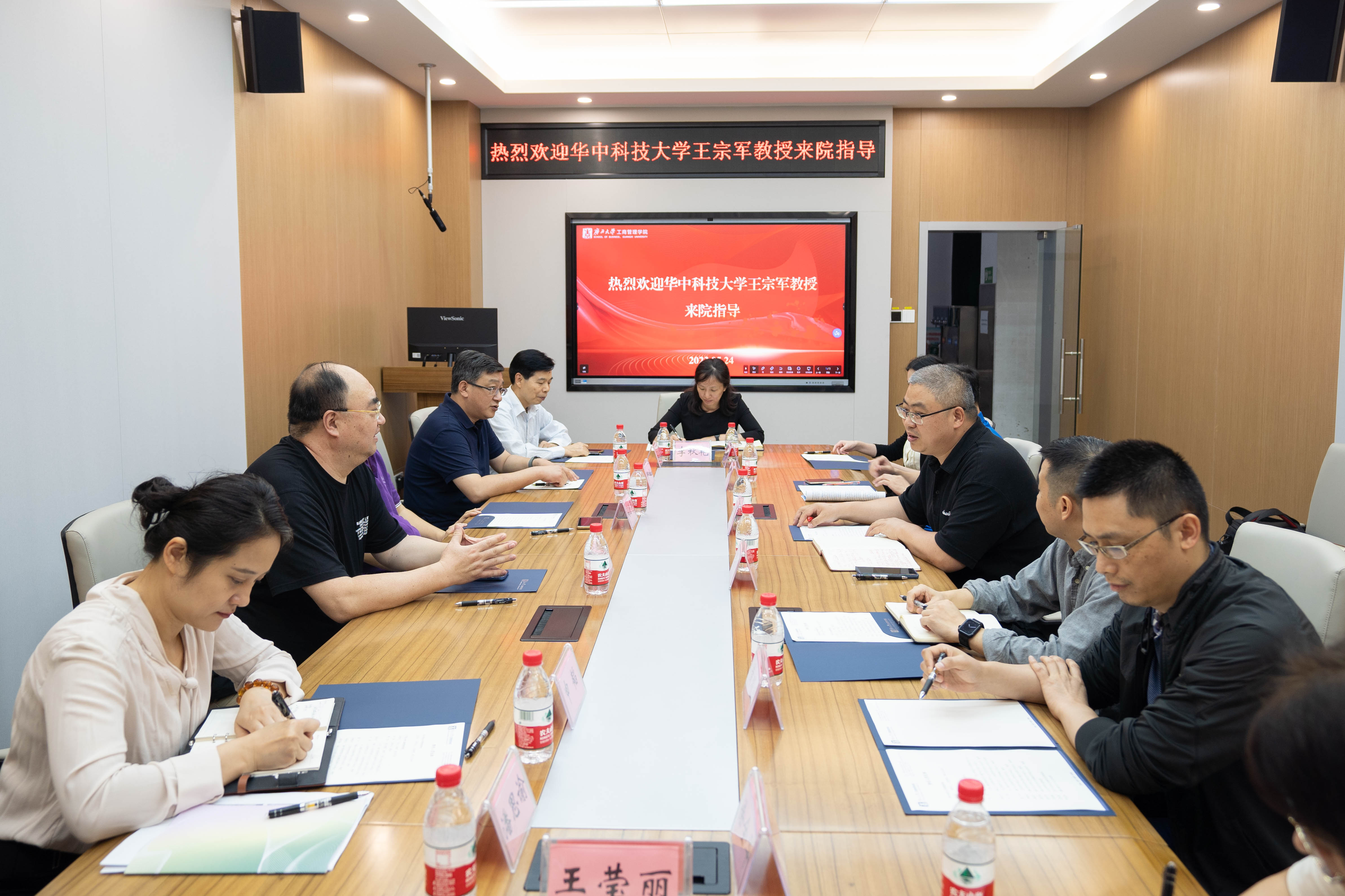 5月24日下午,华中科技大学管理学院原院长、全国MBA教育指导委员会委员王宗军教授莅临2138CC太阳集团交流。学院院长朱帮助、副院长申韬与王宗军教授在233会议室座谈。