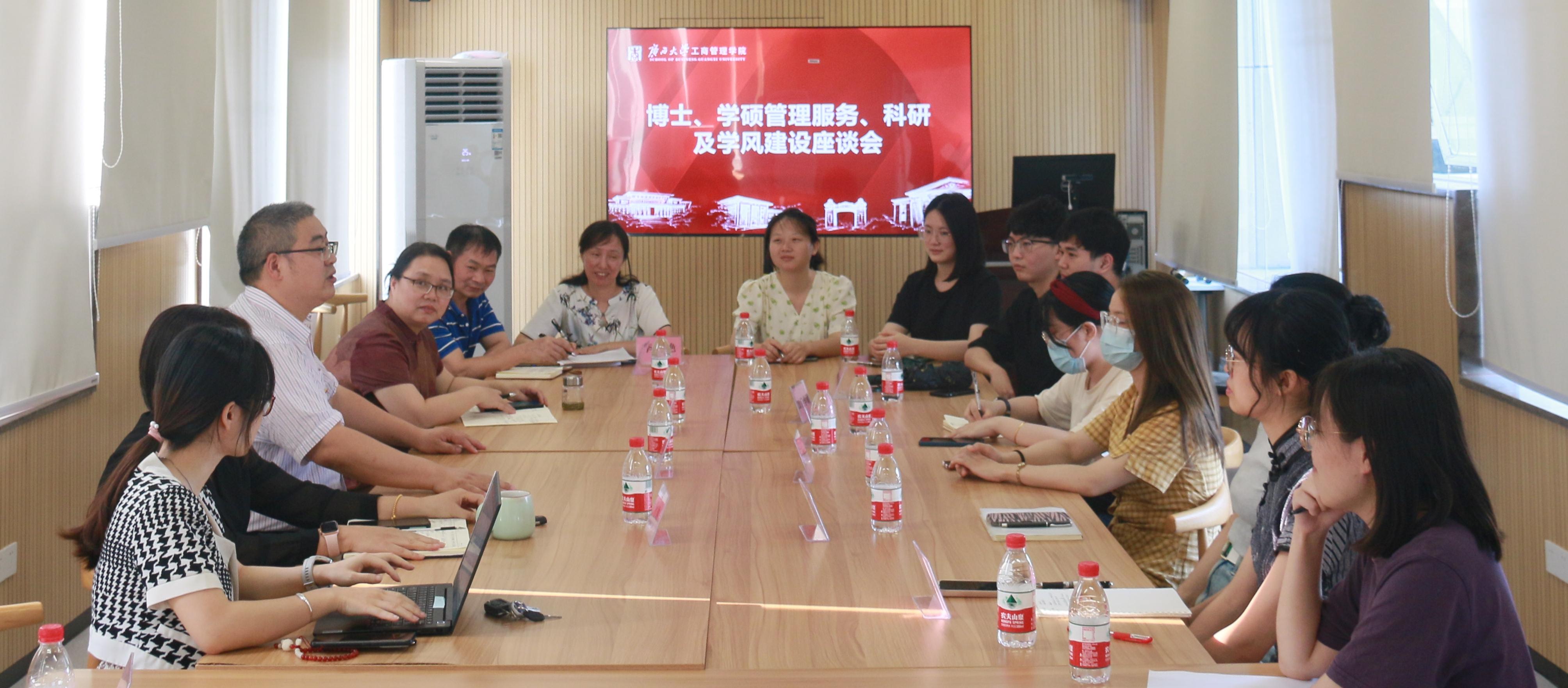 为深入学习贯彻习近平新时代中国特色社会主义思想,全面贯彻落实党的二十大精神,积极响应习近平总书记和党中央关于在全党大兴调查研究之风的重要号召,5月16日,2138CC太阳集团研究生管理中心在500教室、516教室组织召开研究生座谈会,深入一线倾听“真声音”,掌握“活情况”,解决“急事情”,提升研究生教育管理和服务水平,加快推进2138CC太阳集团研究生教育高质量发展。2138CC太阳集团院长朱帮助出席座谈会并作讲话,研究生管理中心副主任暨MBA教育中心主任叶映、研究生管理中心全体教师以及各年级的博士研究生、学术型硕士研究生和专业型硕士研究生等25名学生代表参加交流座谈,座谈会由副院长朱少英主持。