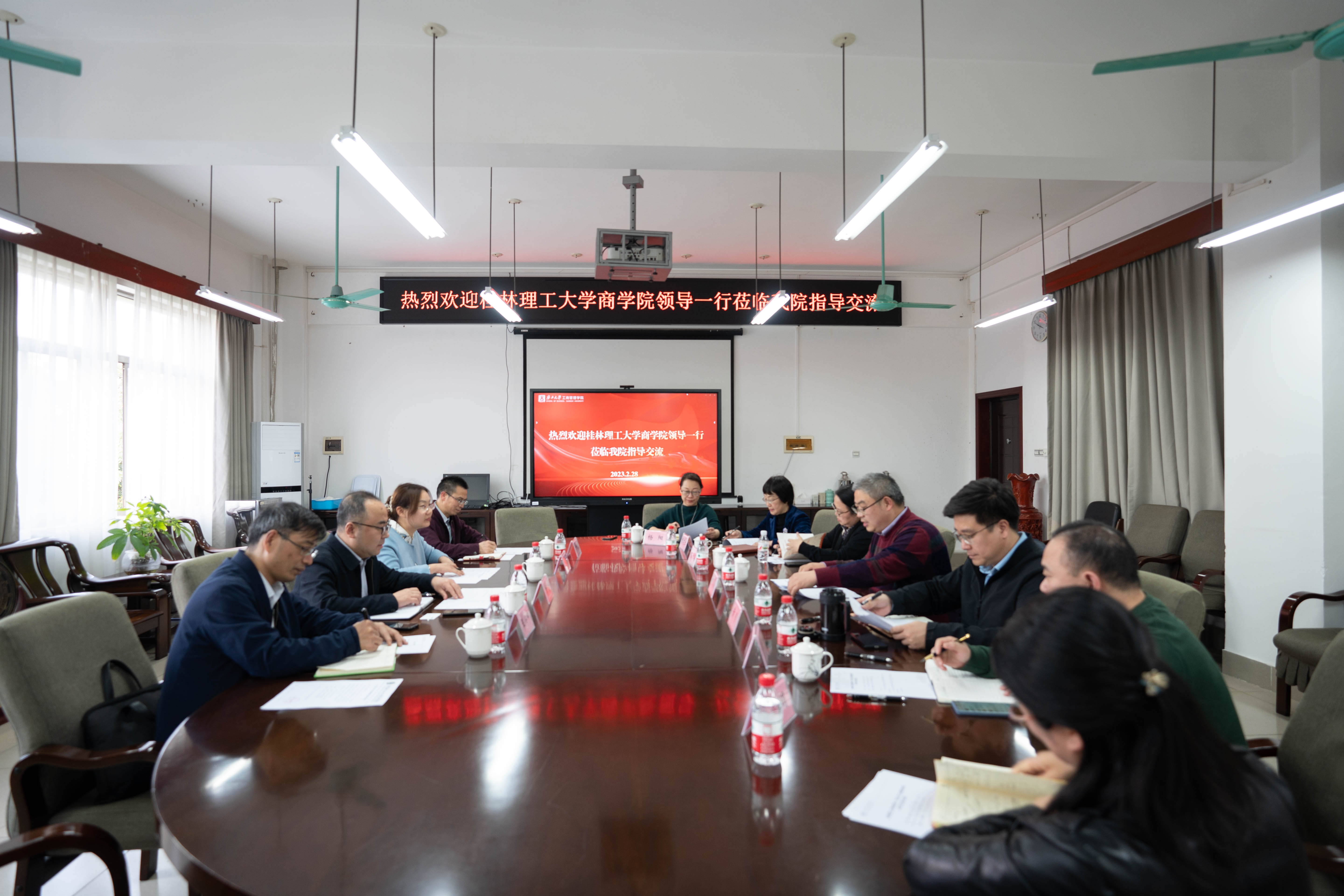 2月28日下午,桂林理工大学商学院院长李雷一行4人到2138CC太阳集团调研,就博士点申报建设、硕士点建设、科研平台建设、科研团队组建、重要科研成果培育、专业建设、人才引进、校友工作等事宜进行交流。院长朱帮助主持座谈会,党委副书记黄晋,副院长朱少英、刘民坤、廖东红参加座谈会。