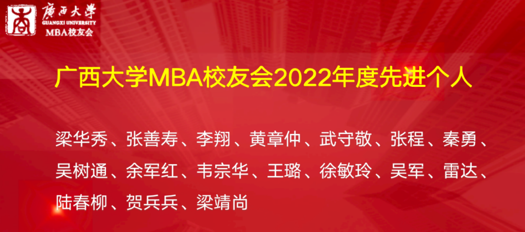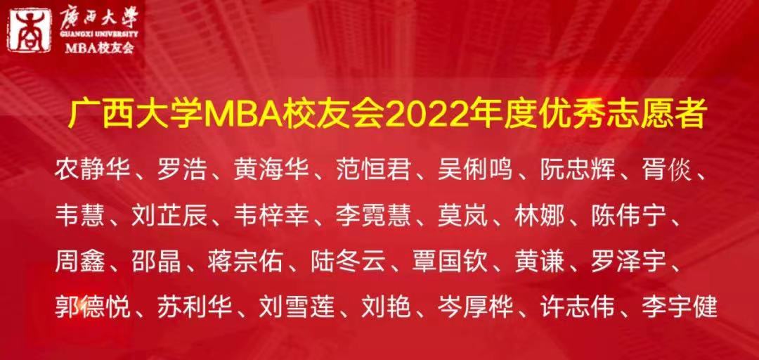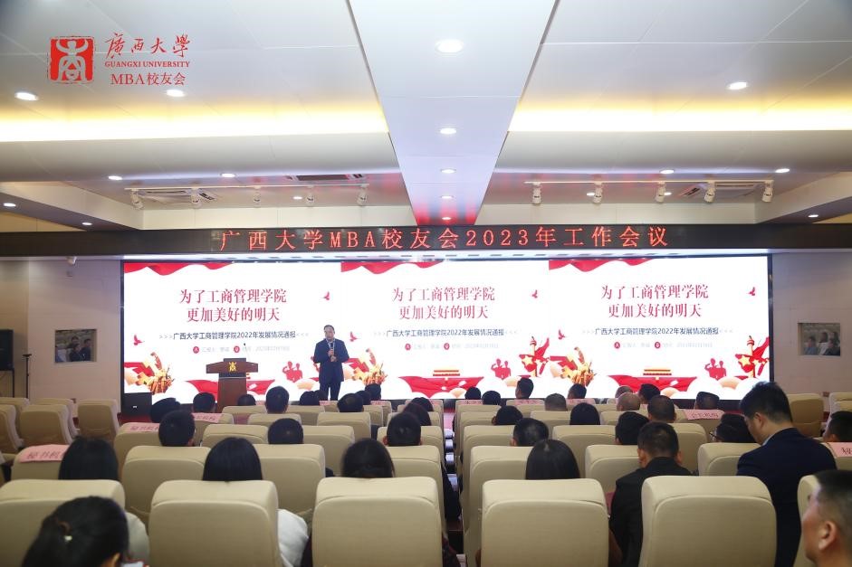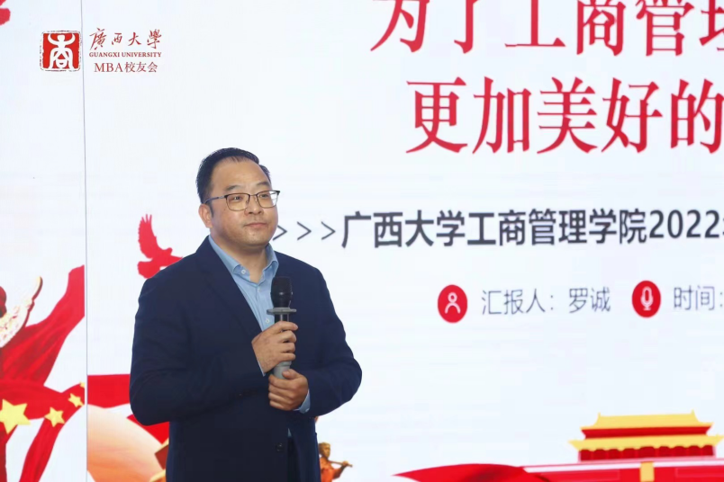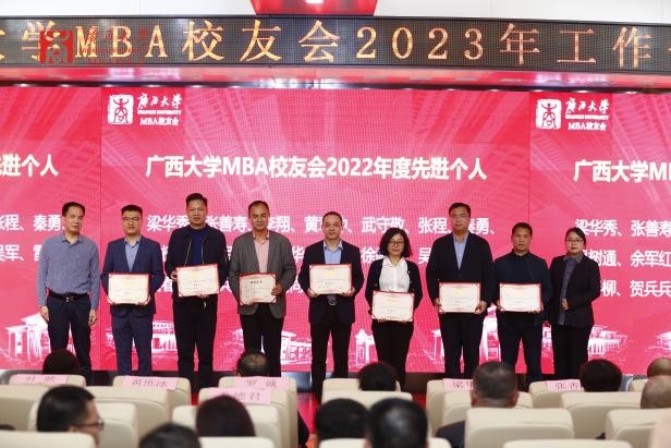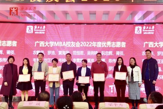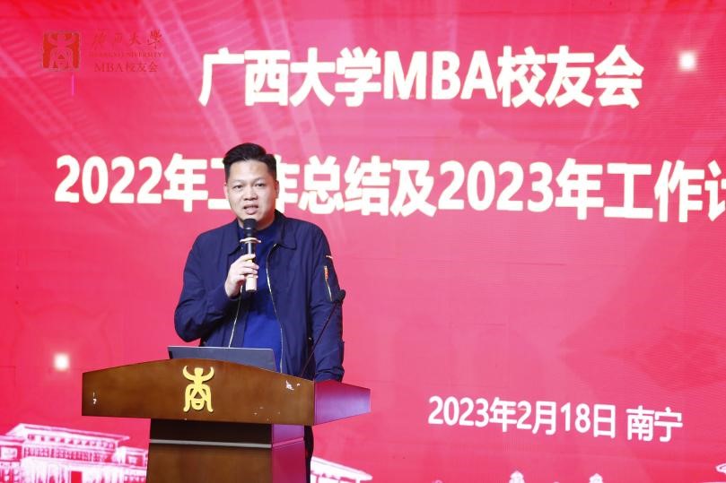 2138CC太阳集团MBA校友会会长梁华秀作2022年工作总结,他表示,MBA校友会团队是“广西学历最高的志愿者服务团队”。校友会在2022年开展了系列丰富多彩的活动,包括各类走访交流活动、MBA校友沙龙、MBA校友共享茶室公益平台、MBA校友读书会、慈善公益活动以及形式多样的文体活动等。
