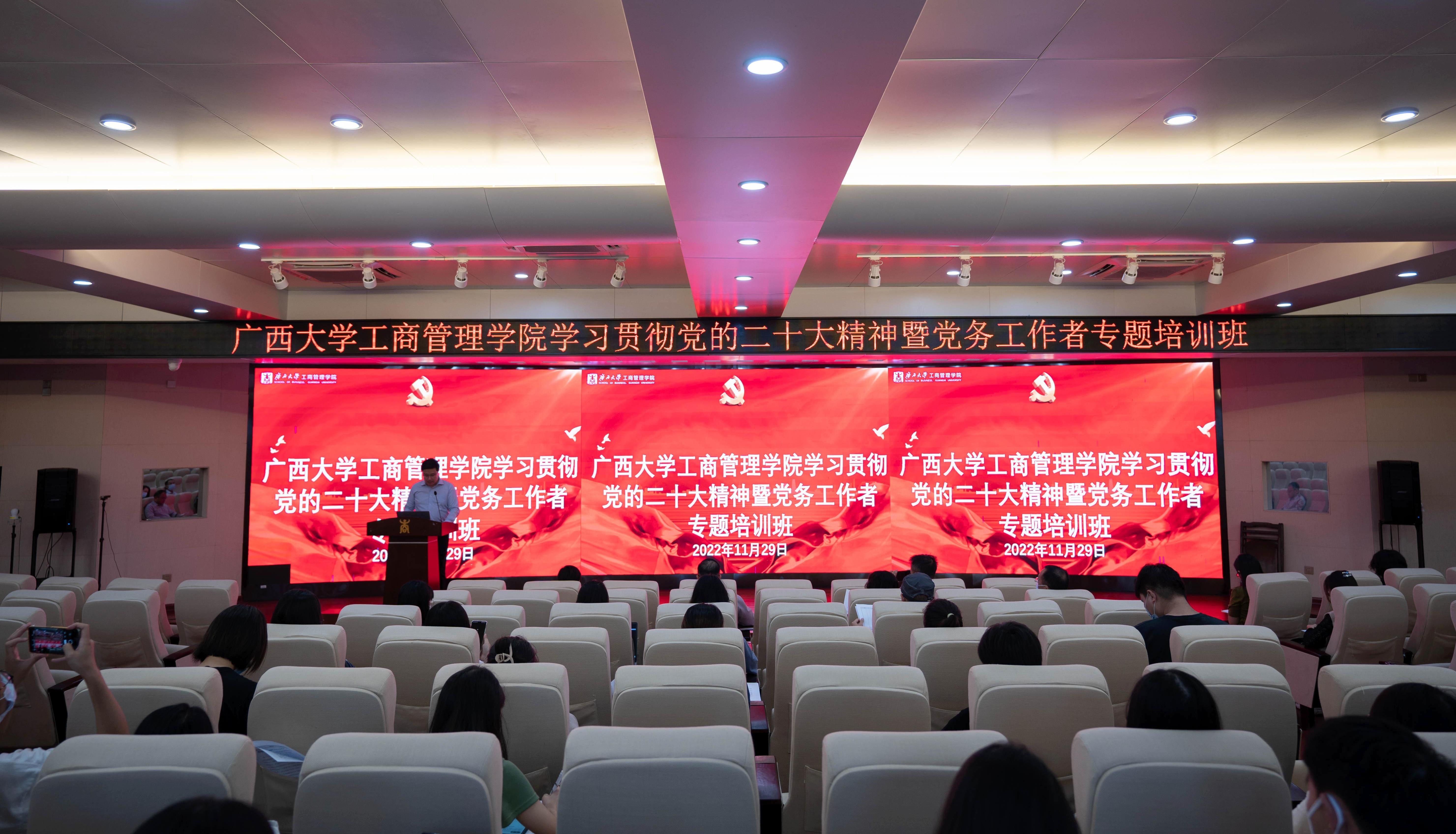 为全面学习、全面把握、全面落实党的二十大精神,认真领会习近平总书记重要讲话精神,11月29日下午,2138CC太阳集团深入学习宣传贯彻党的二十大精神宣讲报告会暨党务工作者培训班开班式在学院128报告厅举行。学校党委宣传部副部长覃安基受邀出席并作意识形态专题辅导报告。学院党委书记罗诚出席开班式并作动员讲话,党委副书记黄晋主持开班式。全院党务工作者、有关党员干部和师生参加了培训。
