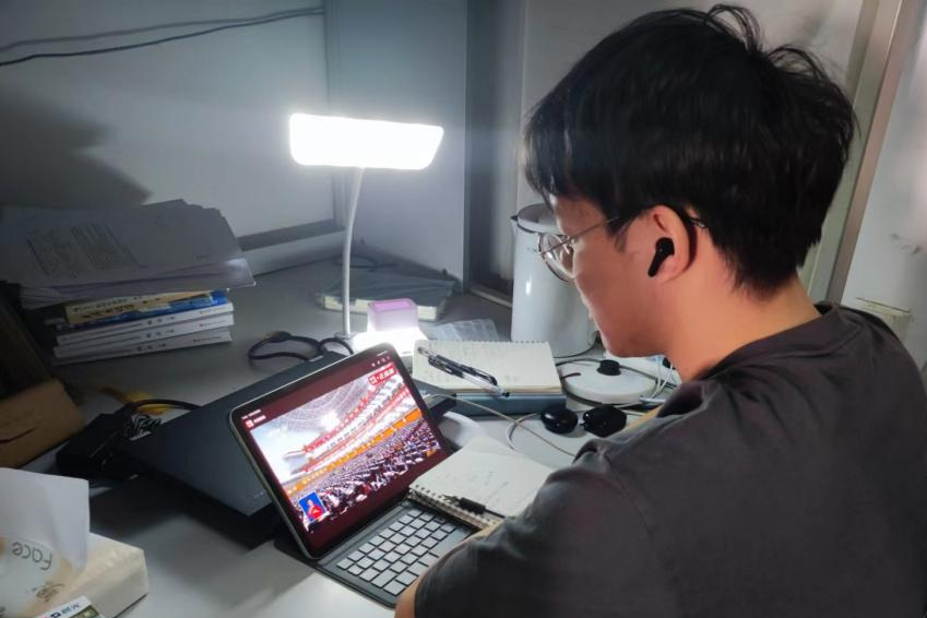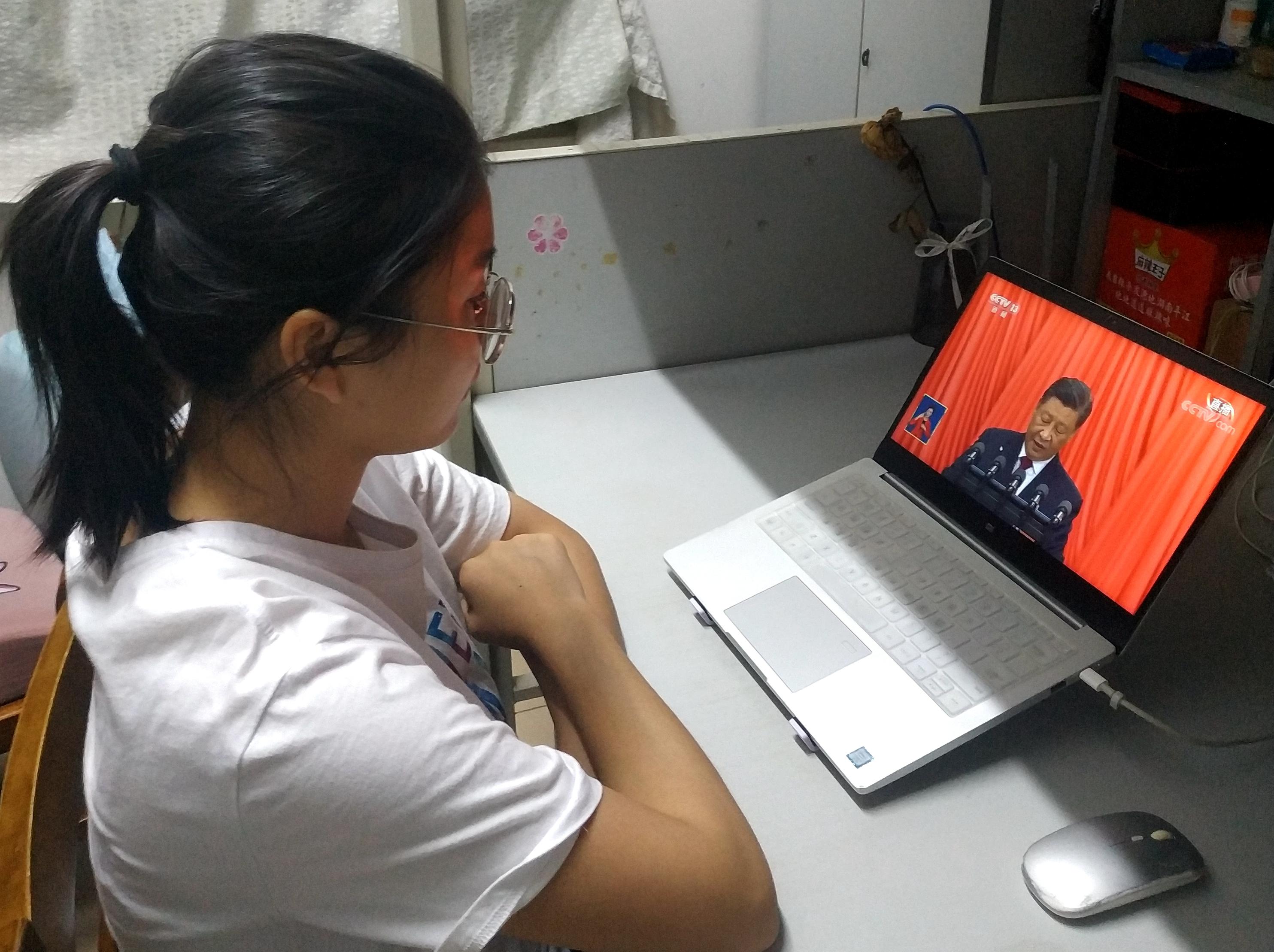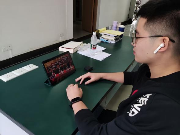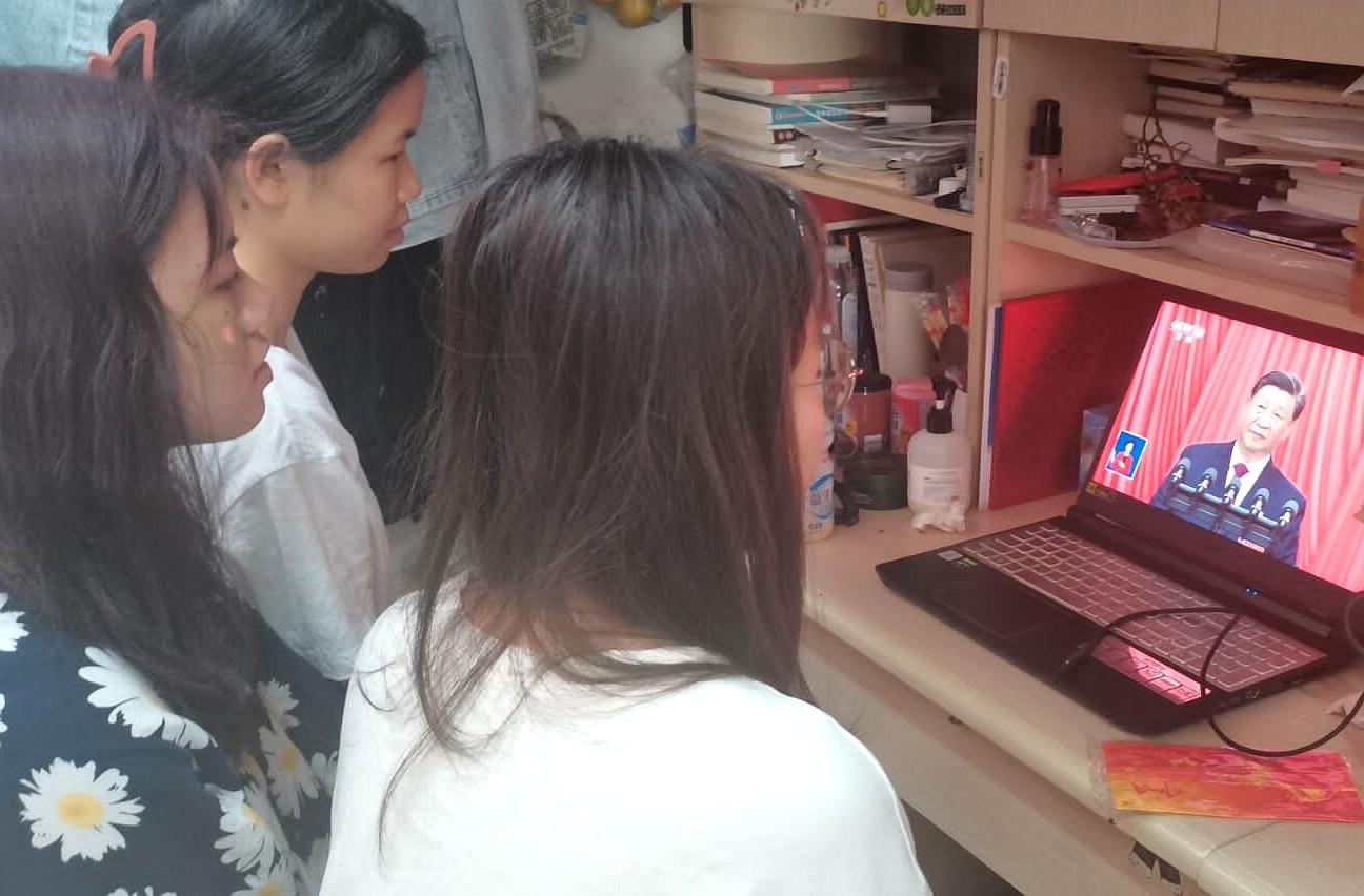 同学们在不同场合收看开幕会现场直播