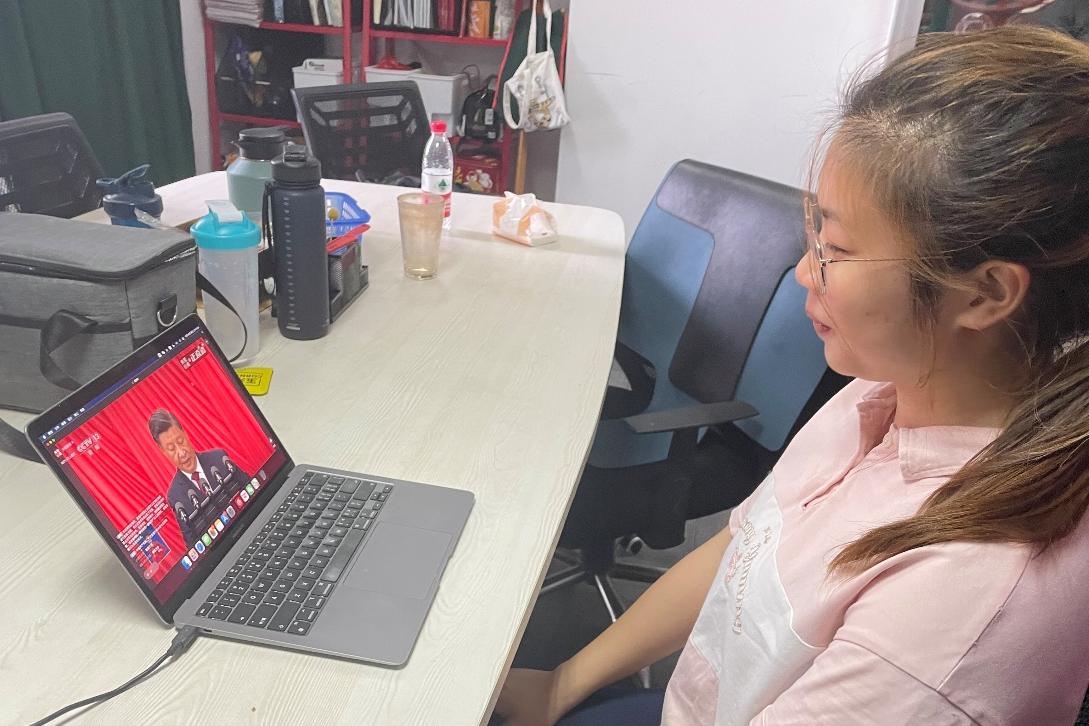 本科生第五党支部预备党员蒋卓君:习近平总书记在报告中提出:建设人人有责,人人尽责、人人享有的社会治理共同体。作为新时代青年,我非常有共鸣。青年是社会力量中最积极、最年轻的力量,我们要加强提升个人的政治素养,坚定不移听党话、跟党走,培养历史使命感与责任感,争做能担当民族复兴大任的时代新人。我们要坚定理想信念,练就过硬本领,以钉钉子的精神刻苦钻研,着力提升专业知识技能,让青春在全面建设社会主义现代化国家的火热实践中绽放绚丽之花。