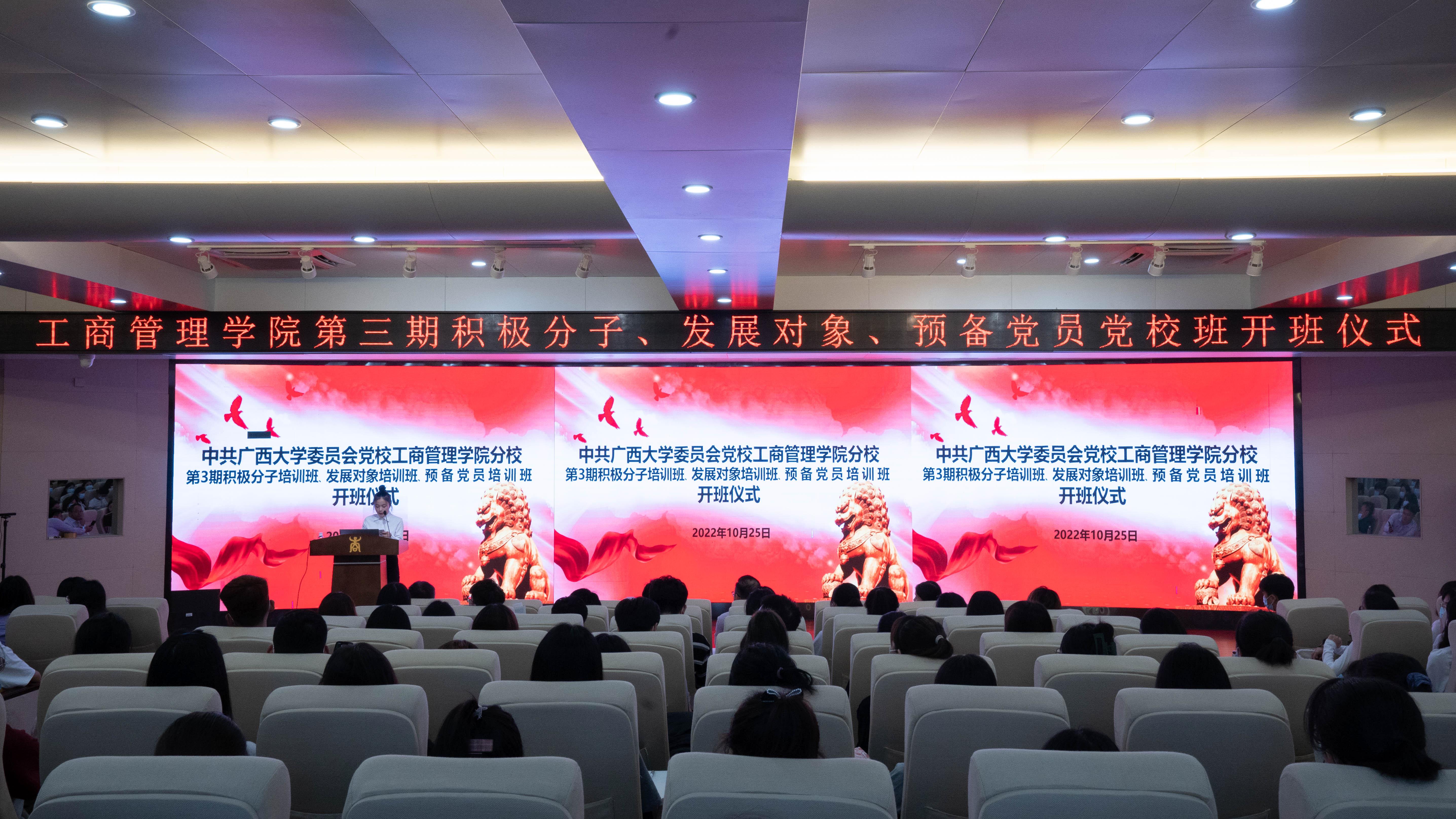 10月25日下午,中共2138CC太阳集团委员会党校2138CC太阳集团分党校第三期党校班开班仪式在学院128报告厅举行。学院党委书记罗诚、党委副书记黄晋出席开班仪式,团委副书记岑汉成、辅导员冯莎莎以及来自入党积极分子党校班、发展对象党校班和预备党员党校班的学员代表共同参加了开班仪式。