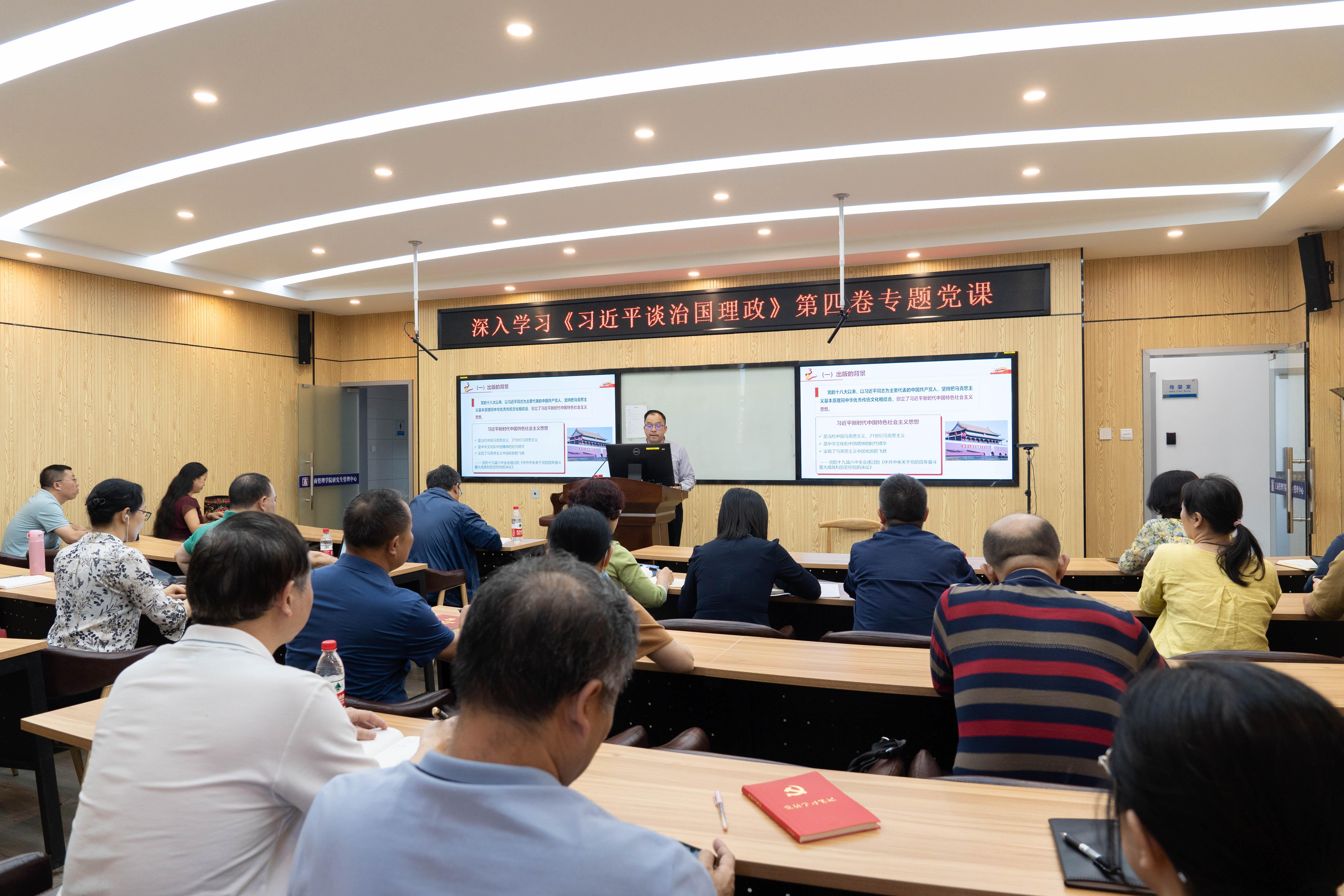 为进一步学好用好《习近平谈治国理政》第四卷,把握其精髓要义,10月18日下午,教工财会党支部、教工旅管党支部和教工信经党支部在学院509B教室联合开展主题党日活动,集体学习《习近平谈治国理政》第四卷。活动中,学院党委书记罗诚应邀以“深入学习《习近平谈治国理政》第四卷”为题,给教工党员讲授专题党课。