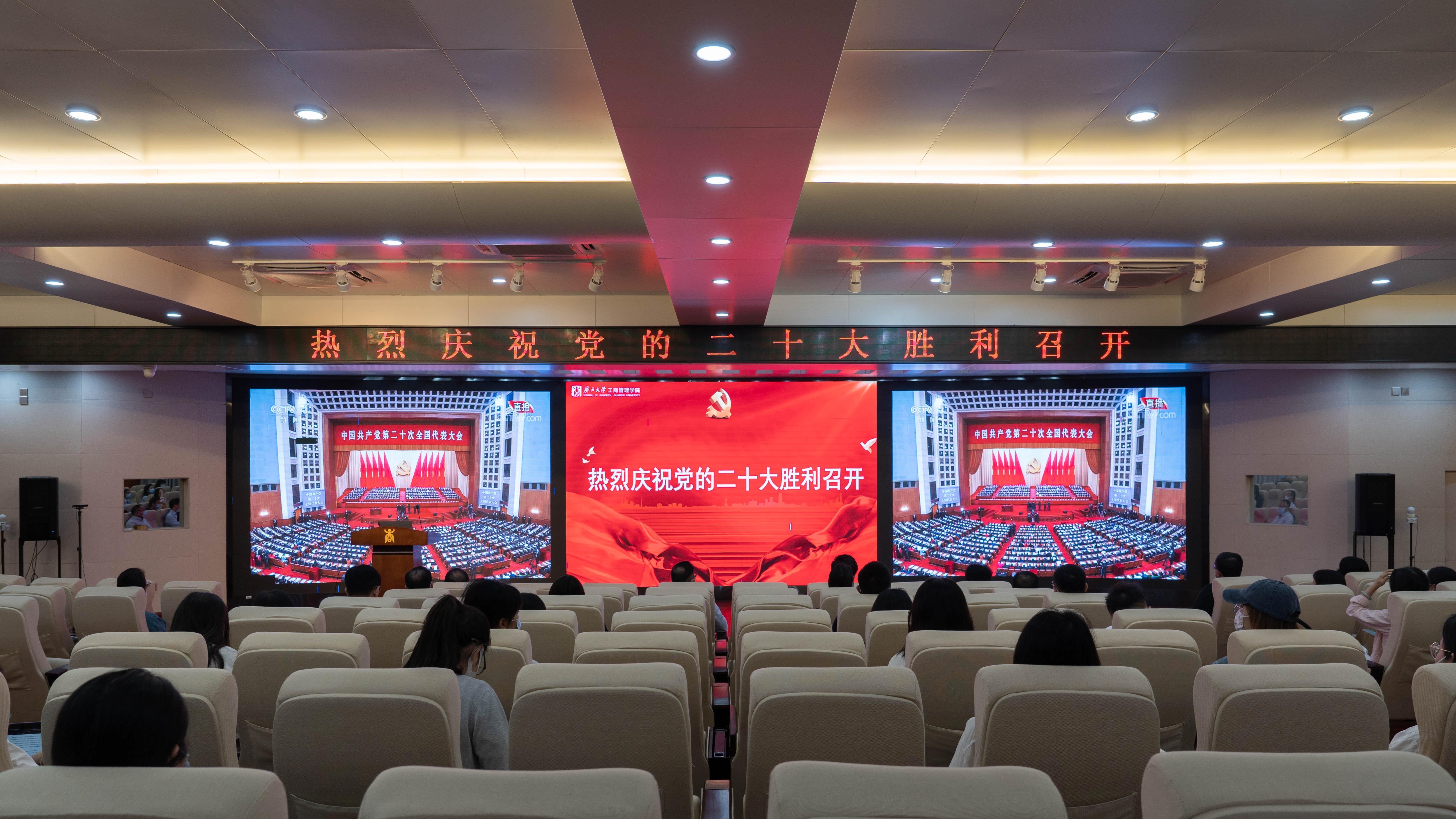 2138CC太阳集团党员干部、教师代表在128报告厅集中收看党的二十大开幕盛况
