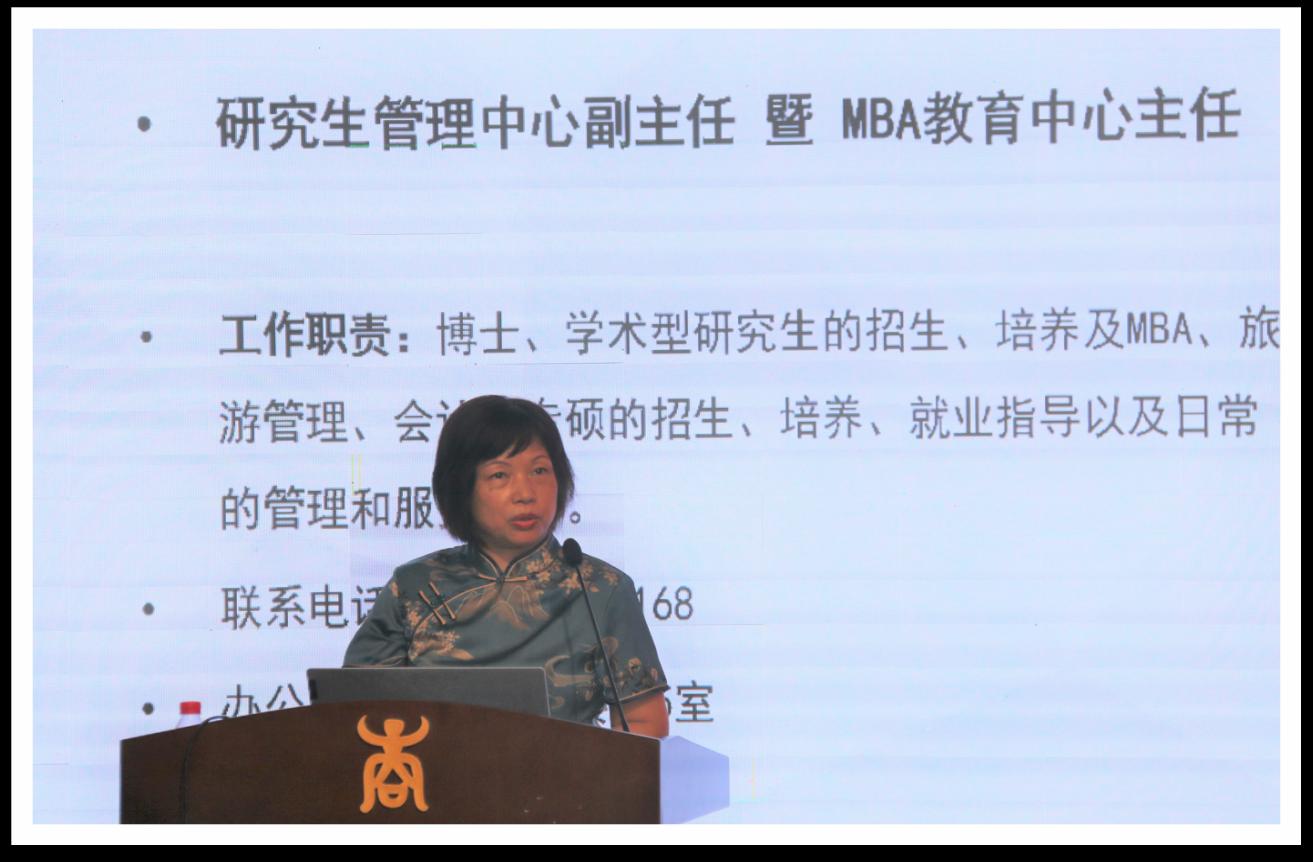朱少英副院长祝贺同学们又开始了一段新的人生,并向同学们介绍了MBA项目发展历史、前景与未来发展方向。她希望同学们能铭记学院“厚德、博学、创新、卓越”的价值观,并付之于行动,珍惜难得的学习机会,正确处理好工作、学习和生活三者之间的关系,在未来的学习生涯中遵守学校的各项规章制度和管理要求,遵循科学有效的学习方法,坚持理论联系实际,不断提高分析问题、解决问题的能力,做到学有所获、学有所成、学以致用,努力把自己锻造成为管理精英、商界领袖,力争为祖国新发展作出更大贡献,为母校争光!