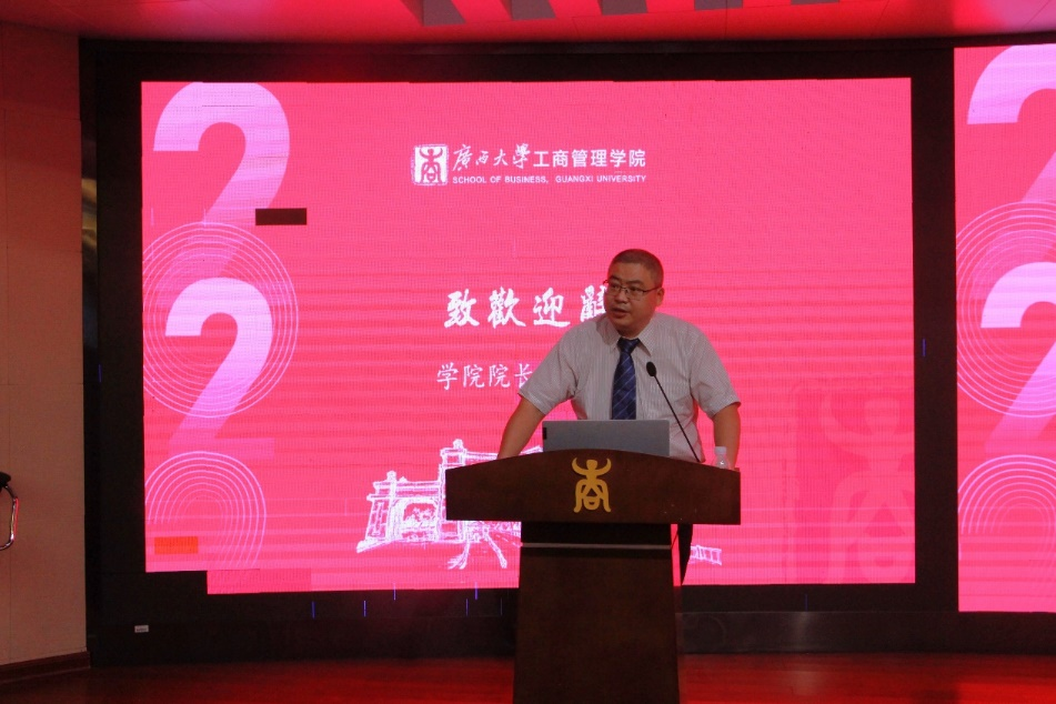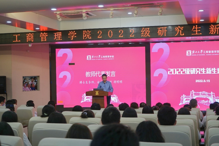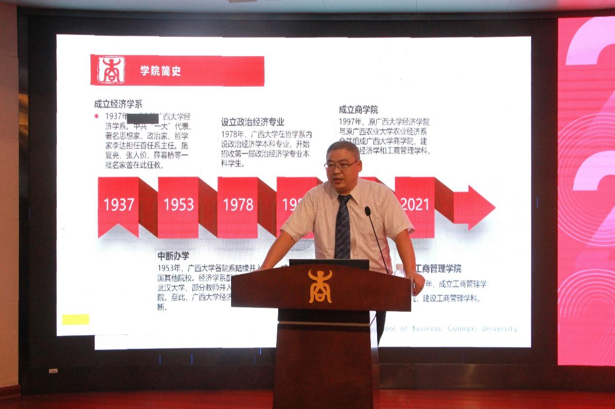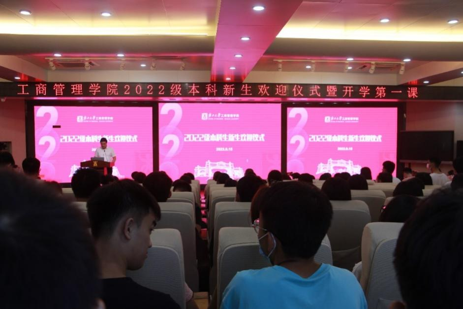 新生欢迎仪式结束后,朱帮助院长为2022级新生上开学第一课。他围绕“学院历史与发展”,结合学院特色、工商管理专业的发展趋势,向新生们指明了学习期间的发展道路。