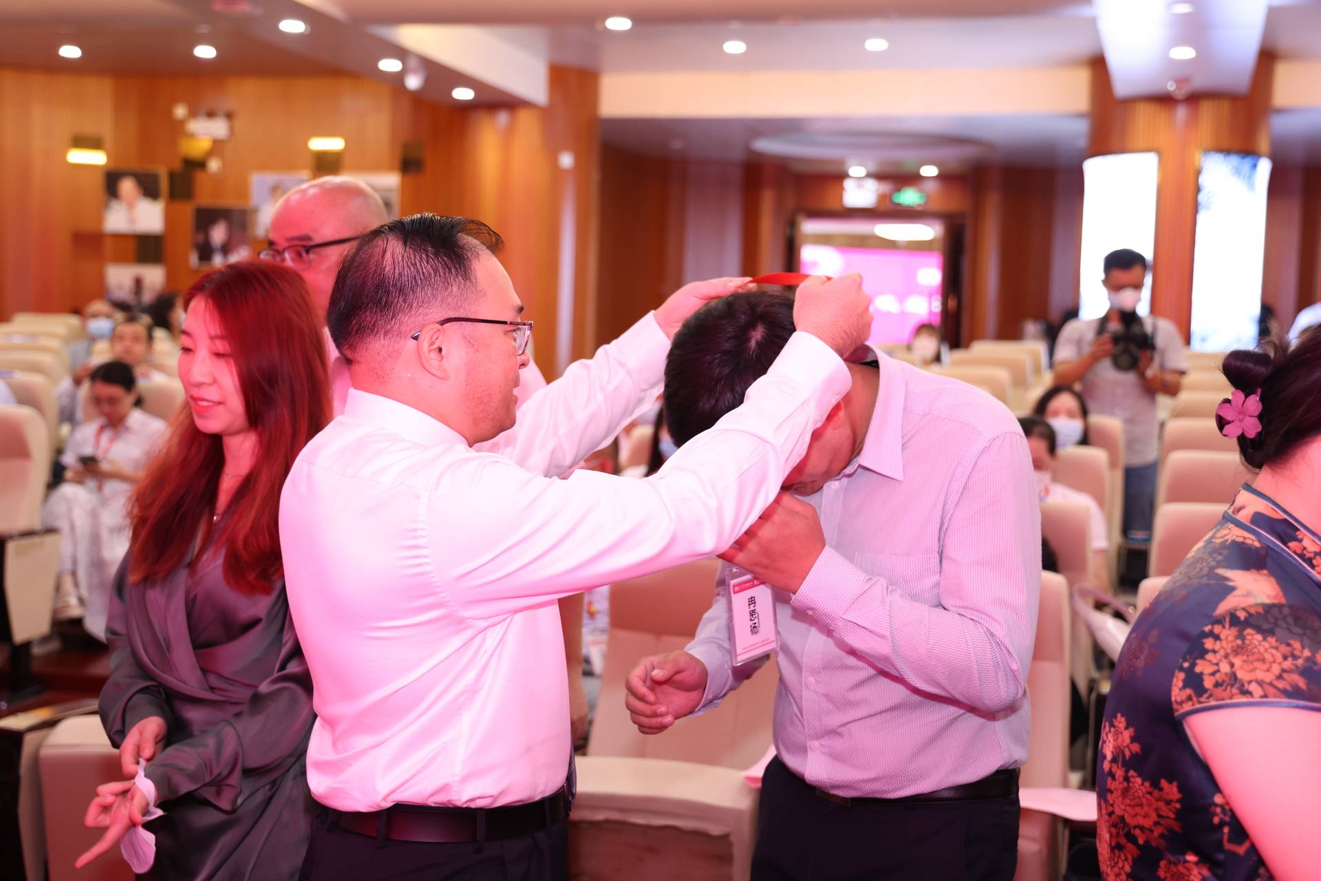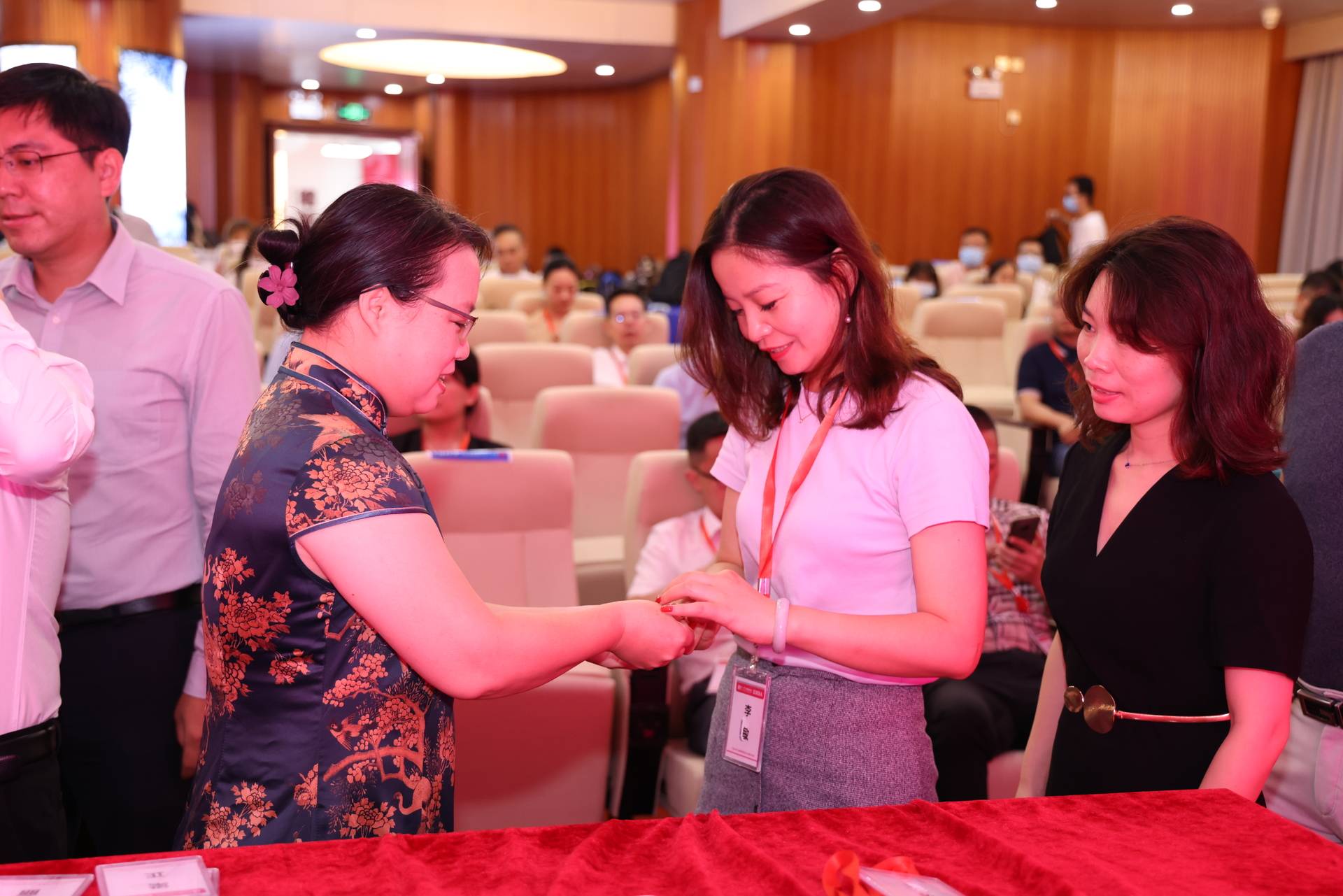 廖东红副院长为EMBA新生佩戴2138CC太阳集团EMBA学员证,赠送2138CC太阳集团校徽