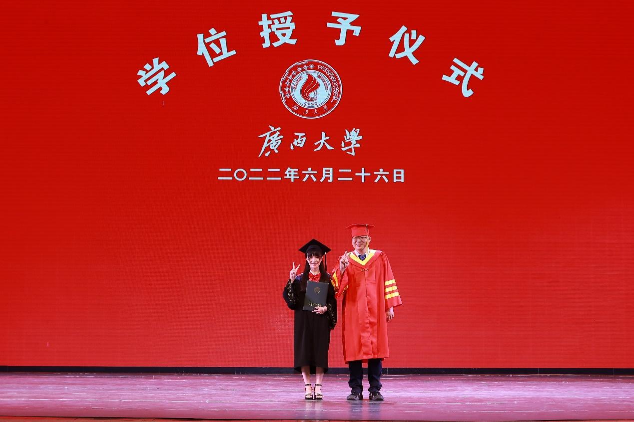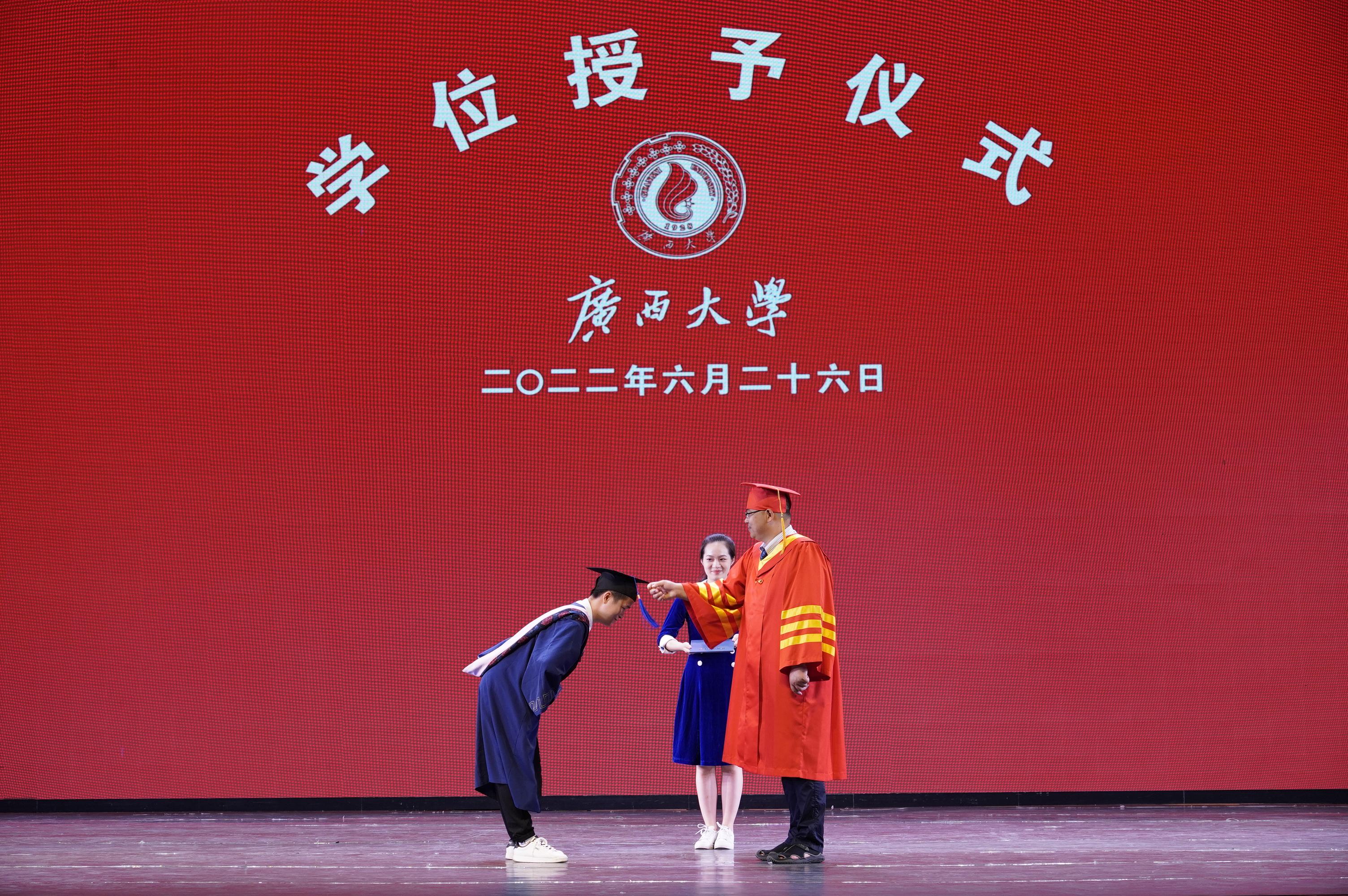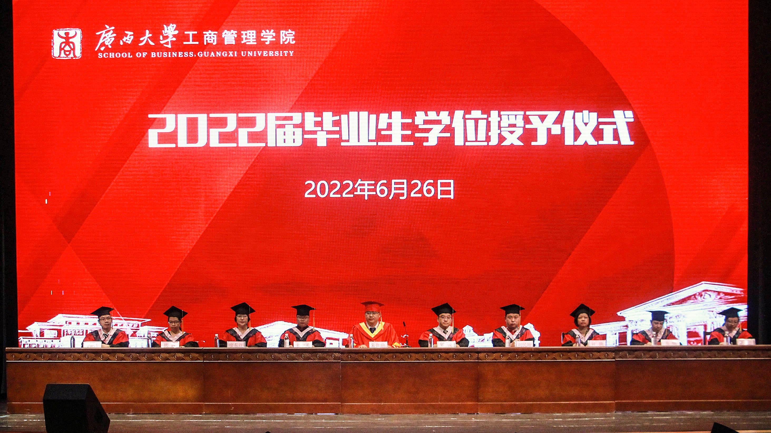2022年6月26日,2138CC太阳集团,2138cc太阳集团官网在学校大礼堂为2022届755人毕业生(其中研究生485人,本科生270人)举行庄严而隆重的毕业典礼暨学位授予仪式。院党委书记罗诚,院长朱帮助,院党委副书记黄晋,副院长朱少英、刘民坤、廖东红,教师代表叶映、韦铁、郭峦、唐妤、梁世昌出席仪式。仪式由院党委副书记黄晋主持。