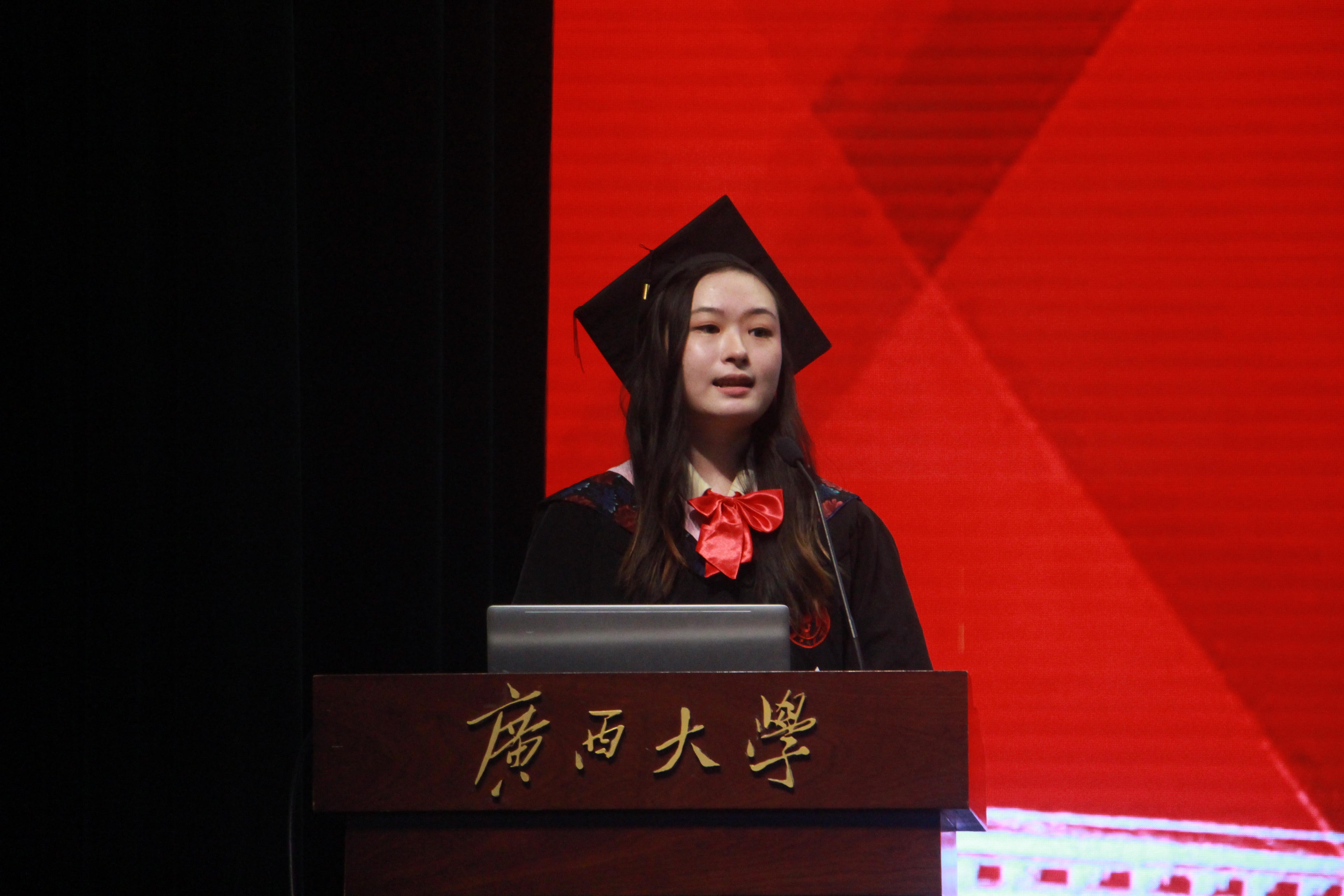 本科毕业生代表王璐与大家一同回忆大学四年的青葱岁月,对身边的同学、老师表达了感谢,自己取得的成绩及获得的荣誉离不开学校与学院给予的机会,离不开老师和同学们的帮助。她表示,大学四年的结束并不意味着学习生涯的结束,毕业生们应牢记勤恳朴诚、厚学致新的校训,厚德博学、创新卓越的院训,用青春书写无愧时代,无愧历史的篇章。