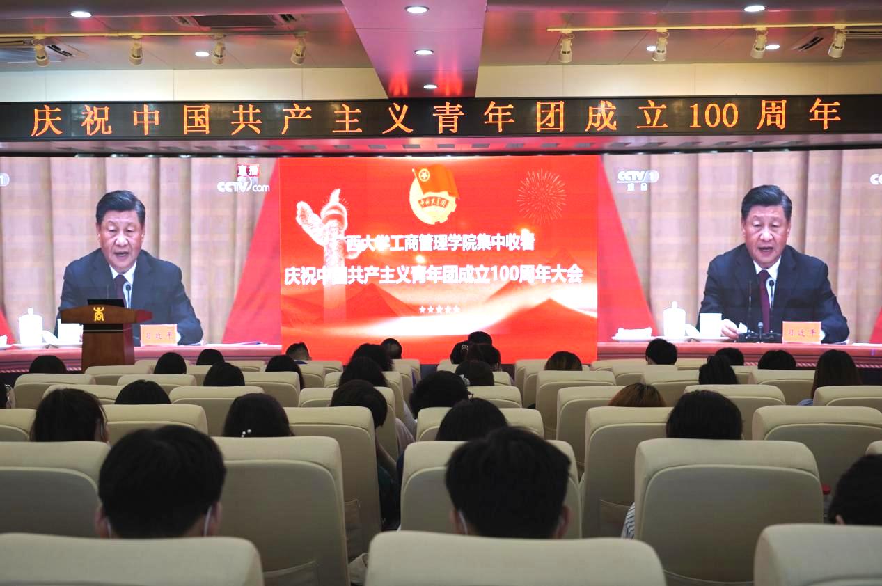 学院党委书记罗诚、党委副书记黄晋、团委副书记岑汉成和同学们在学院128报告厅集中收看了本次大会实时直播。院团委书记马丽娟在校团委参加学校组织的集中收看。