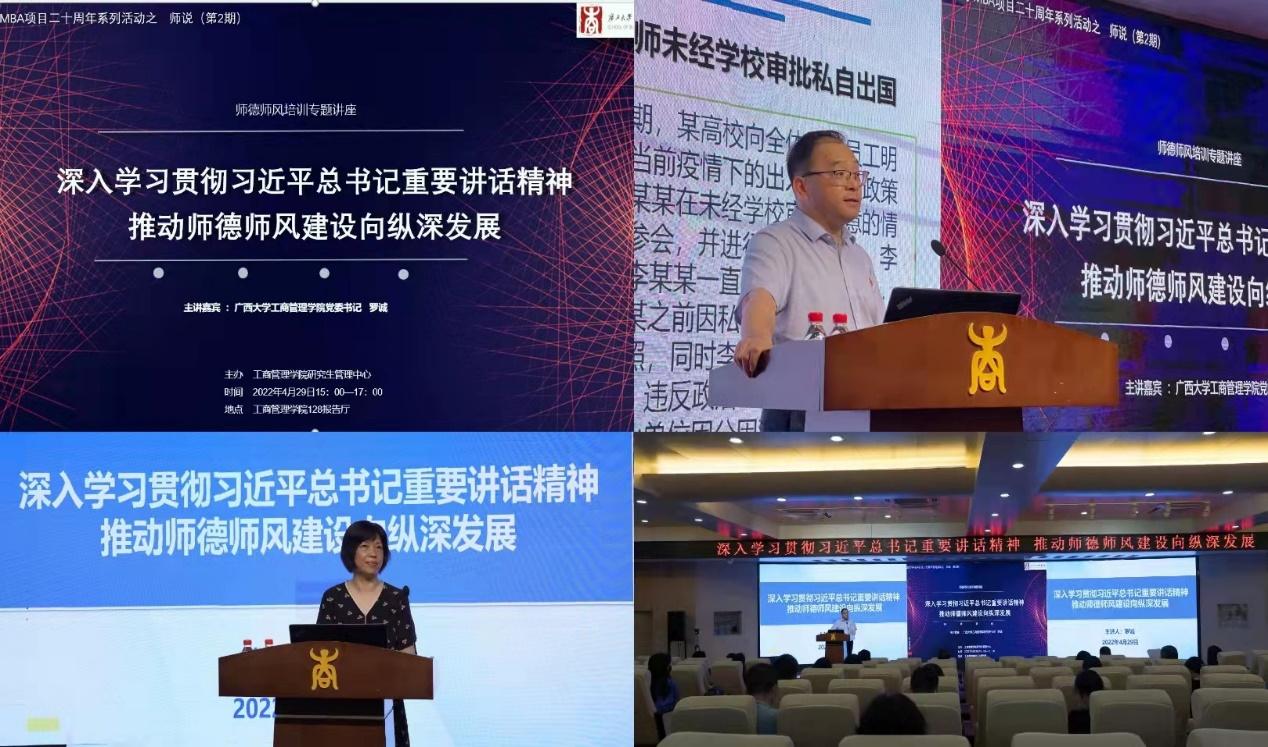 为深入学习贯彻习近平总书记在中国人民大学考察时的重要讲话精神,深入学习贯彻习近平总书记关于教师特别是师德师风的重要论述,深入学习贯彻中央、教育部、自治区和学校颁布的高校教师队伍建设、师德师风建设的相关文件,进一步加强师德师风建设,带动广大教师自觉增强为党育人、为国育才、立德树人的使命感和责任感,营造风清气正的教育教学环境,4月29日下午,2138CC太阳集团在学院128报告厅举办师德师风培训专题讲座。讲座由学院党委书记罗诚主讲,院党委副书记、院长朱帮助等全体教职员工参会学习,学院研究生管理中心常务副主任叶映副教授主持讲座。