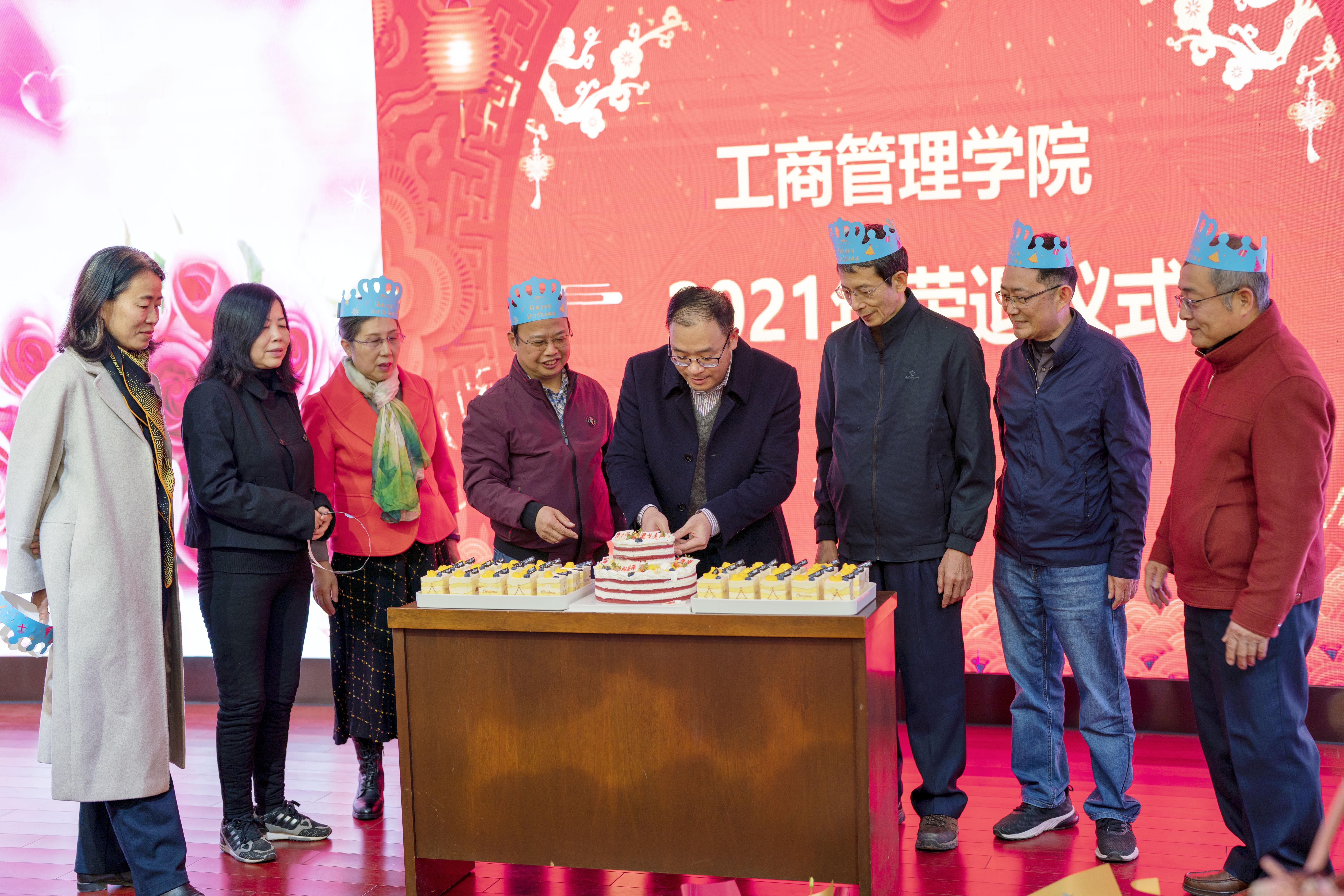 最后,学院领导给退休教师颁发荣退证书、纪念品和鲜花。罗诚与荣退教师一起切蛋糕,送上真诚的祝福!