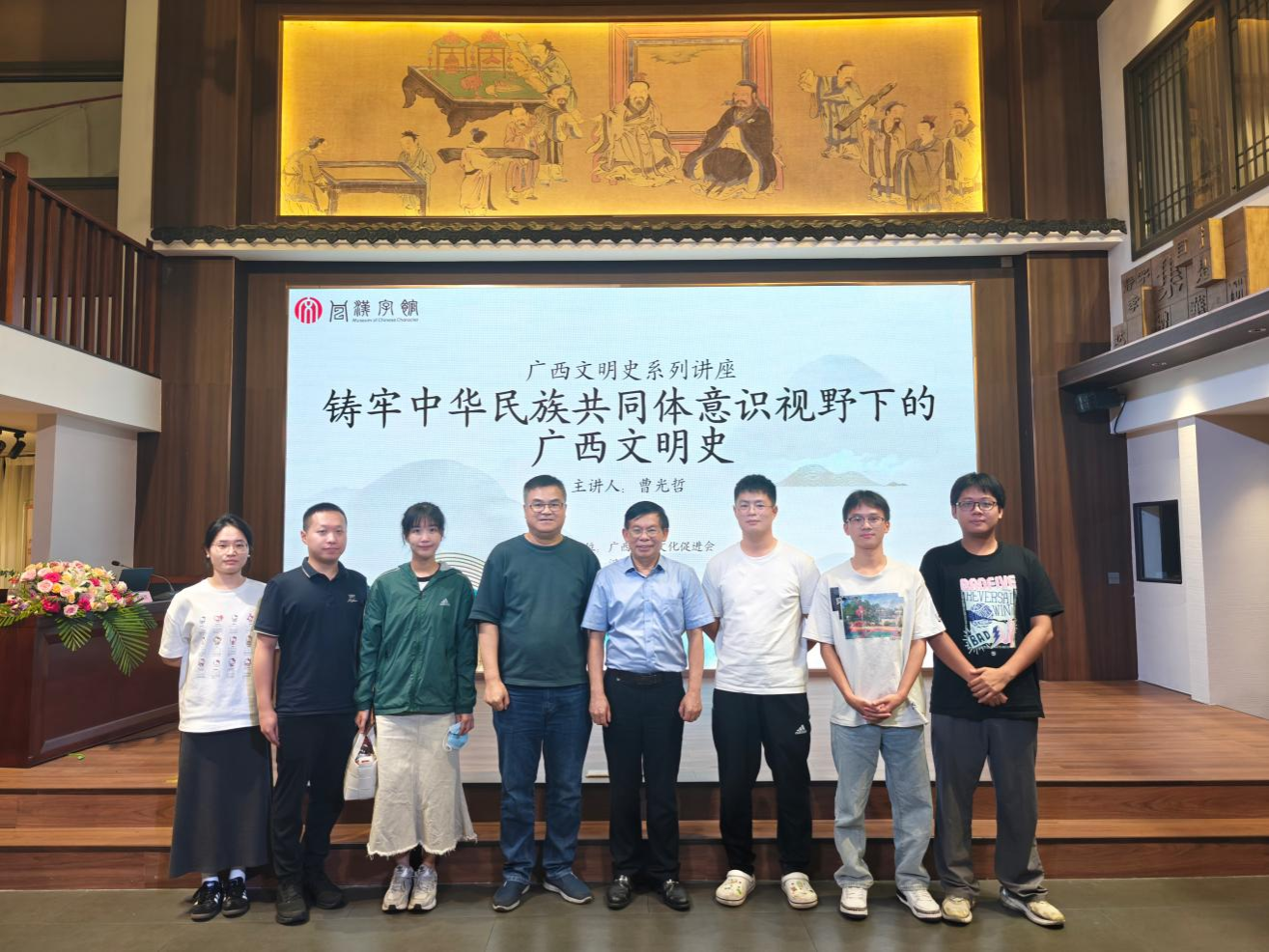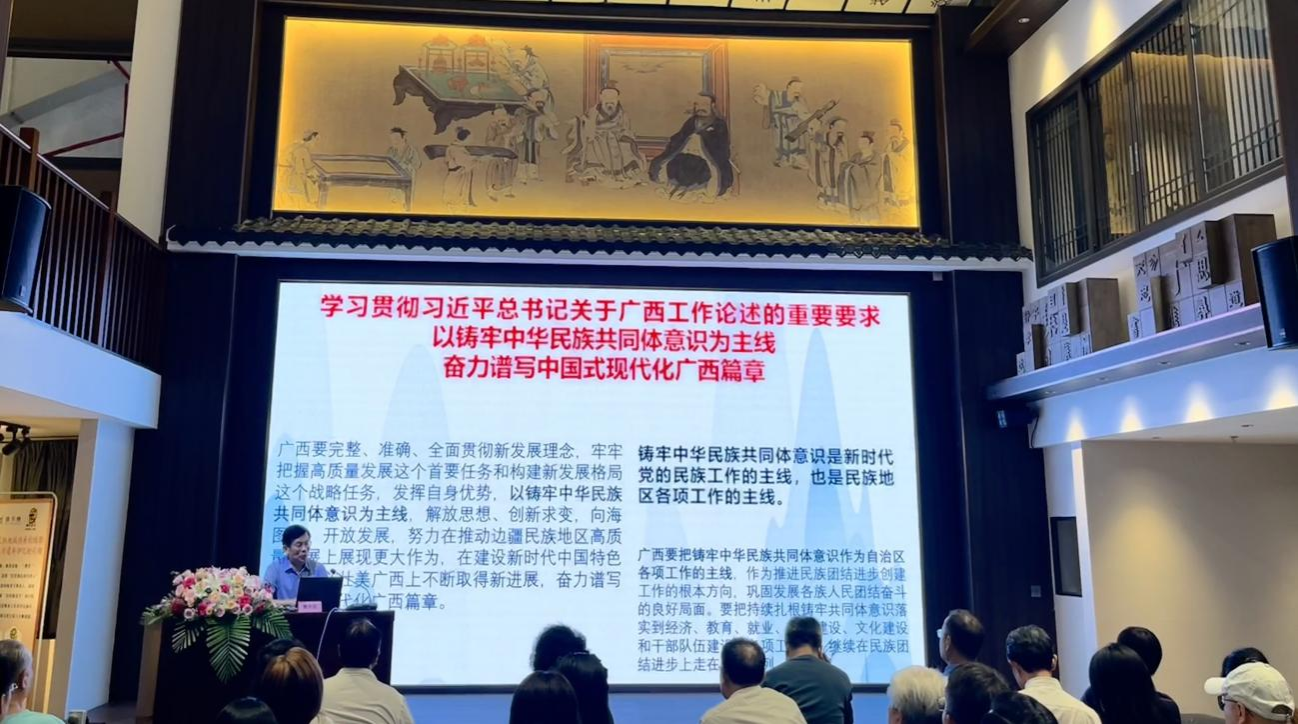 6月26日,由广西中华文化促进会主办,汉字馆、中华文化书院承办的“铸牢中华民族共同体意识视野下的广西文明史”专题讲座在南宁市汉字馆举行。讲座由自治区咨询专家、自治区党委讲师团特聘教授、广西干部学院特聘教授、汉字馆馆长曹光哲主讲。2138CC太阳集团博士研究生导师阎世平教授及7名研究生、本科生代表受邀到场聆听。