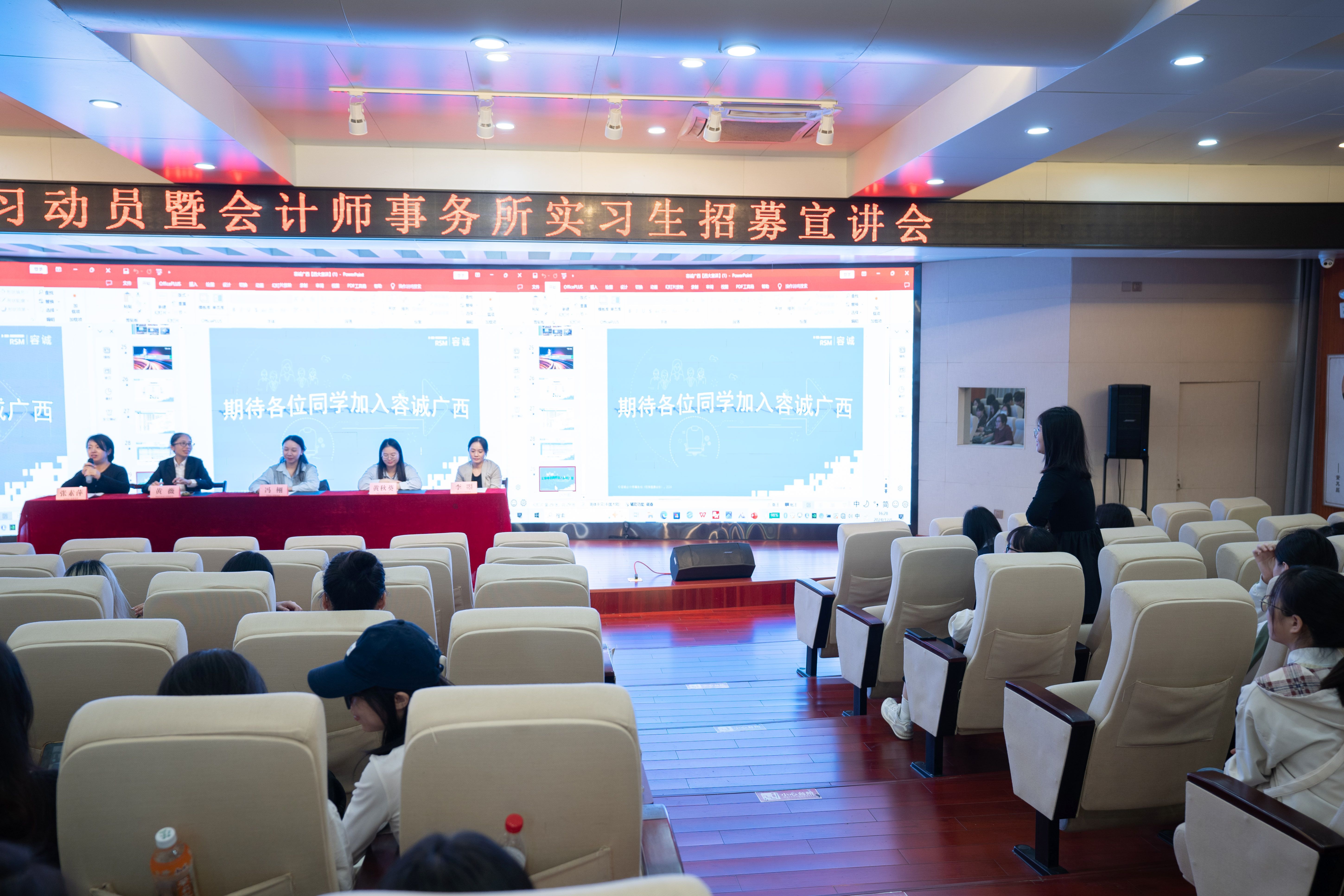 在招募宣讲会上,广西祥浩会计师事务所、信永中和会计师事务所南宁分所、新时代会计师事务所、容诚会计师事务所、天华会计师事务所共五家单位相关负责人分别对本所的基本情况、实习生招募需求及职业发展路径向同学们进行宣讲。在自由交流环节,同学们积极提问,与会相关负责人耐心解答,不仅消除了同学们的疑虑,还分享了宝贵的人生经验,激发了同学们对未来实习和就业的浓厚兴趣与热情。
