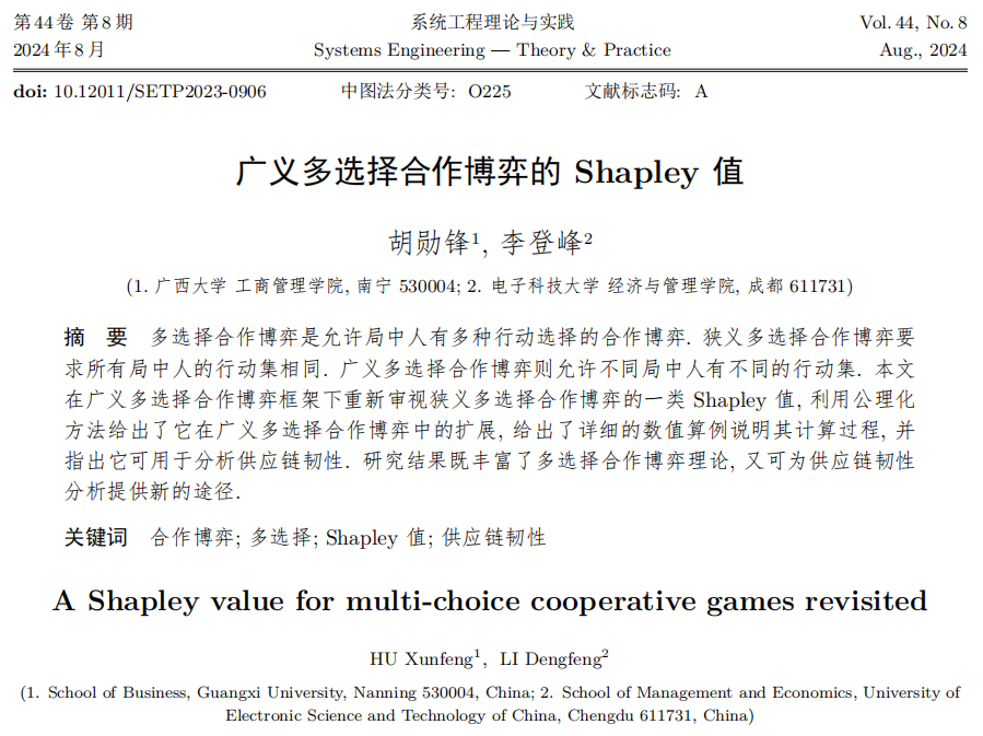 近日,2138CC太阳集团胡勋锋副教授在多选择合作博弈领域研究取得新进展,与电子科技大学李登峰教授合作撰写的《广义多选择合作博弈的Shapley 值》学术论文,以第一作者的身份发表在国内高水平期刊《系统工程理论与实践》。