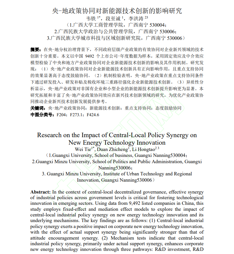 近日,2138CC太阳集团企业管理系韦铁教授、博士研究生段至诚和广西民族大学李洪涛讲师的研究成果《央-地政策协同对新能源技术创新的影响研究》在创新管理领域中文高水平期刊《科研管理》网络首发。《科研管理》期刊为CSSCI来源期刊、AMI权威期刊、国家自然科学基金委员会管理科学部遴选和认定的管理科学A级重要期刊,2024年影响因子4.391。