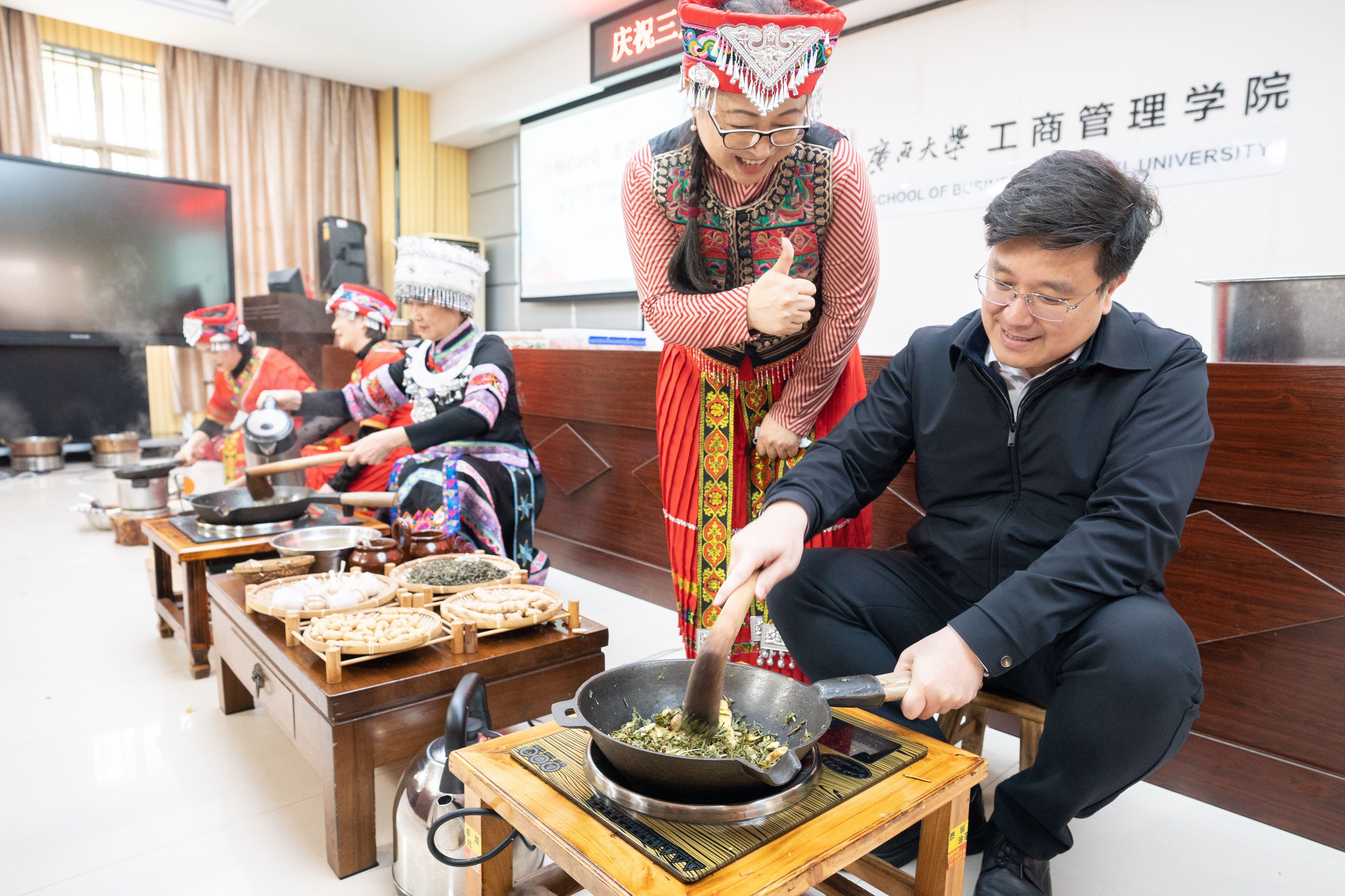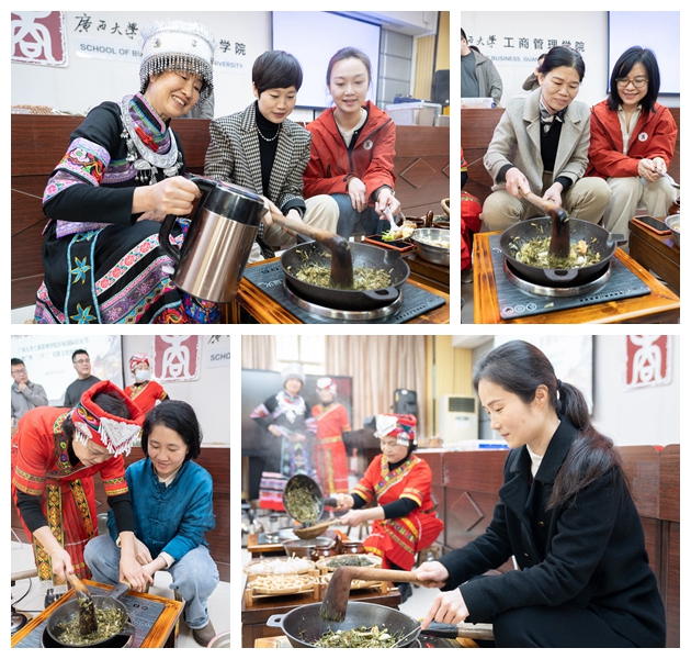 在恭城油茶非遗文化展示区,一股浓郁的油茶香扑鼻而来。工作人员首先为大家详细介绍了恭城油茶的历史渊源、制作工艺及文化价值,随后进行了精彩的打油茶表演。只见瑶族姐妹手法娴熟地将茶叶、生姜、大蒜等原料放入特制的油茶锅中,经过反复捶打、翻炒,一锅香气四溢的油茶便新鲜出炉。老师们纷纷品尝,对恭城油茶的独特风味赞不绝口。品尝之余,大家还饶有兴致地上手学习打油茶,体验着这项非物质文化遗产的独特魅力。