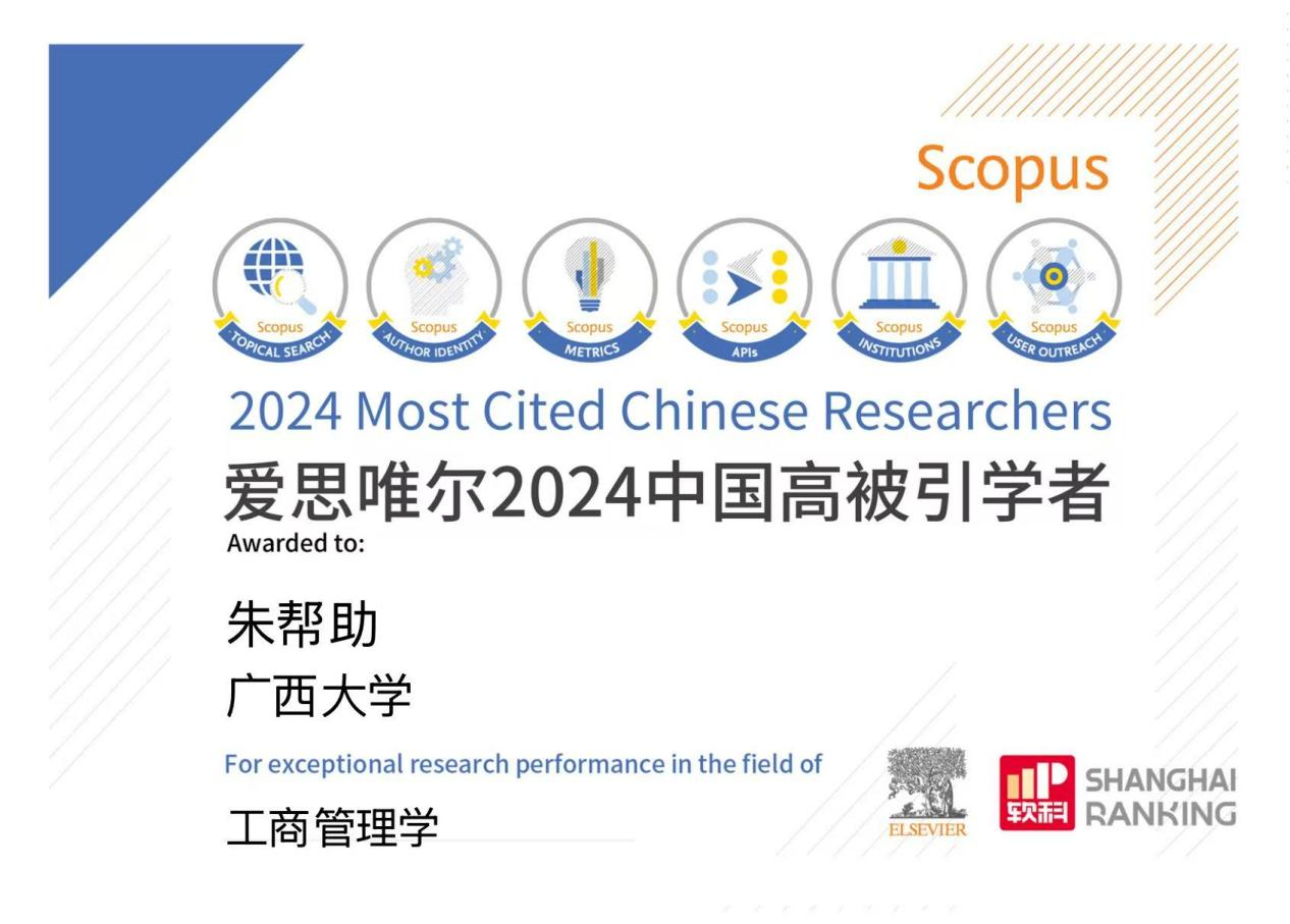 朱帮助教授自2021年以来连续4年入选“中国高被引学者”榜单,这对推动我校工商管理学科发展、扩大学校全球影响力有着积极影响。未来,2138CC太阳集团,2138cc太阳集团官网将继续聚焦于国家战略需求和区域发展需求,开展创新性研究,进一步服务国家战略和广西经济社会发展,助力推进学校“双一流”建设和部区合建,不断提升科技创新和人才培养能力。