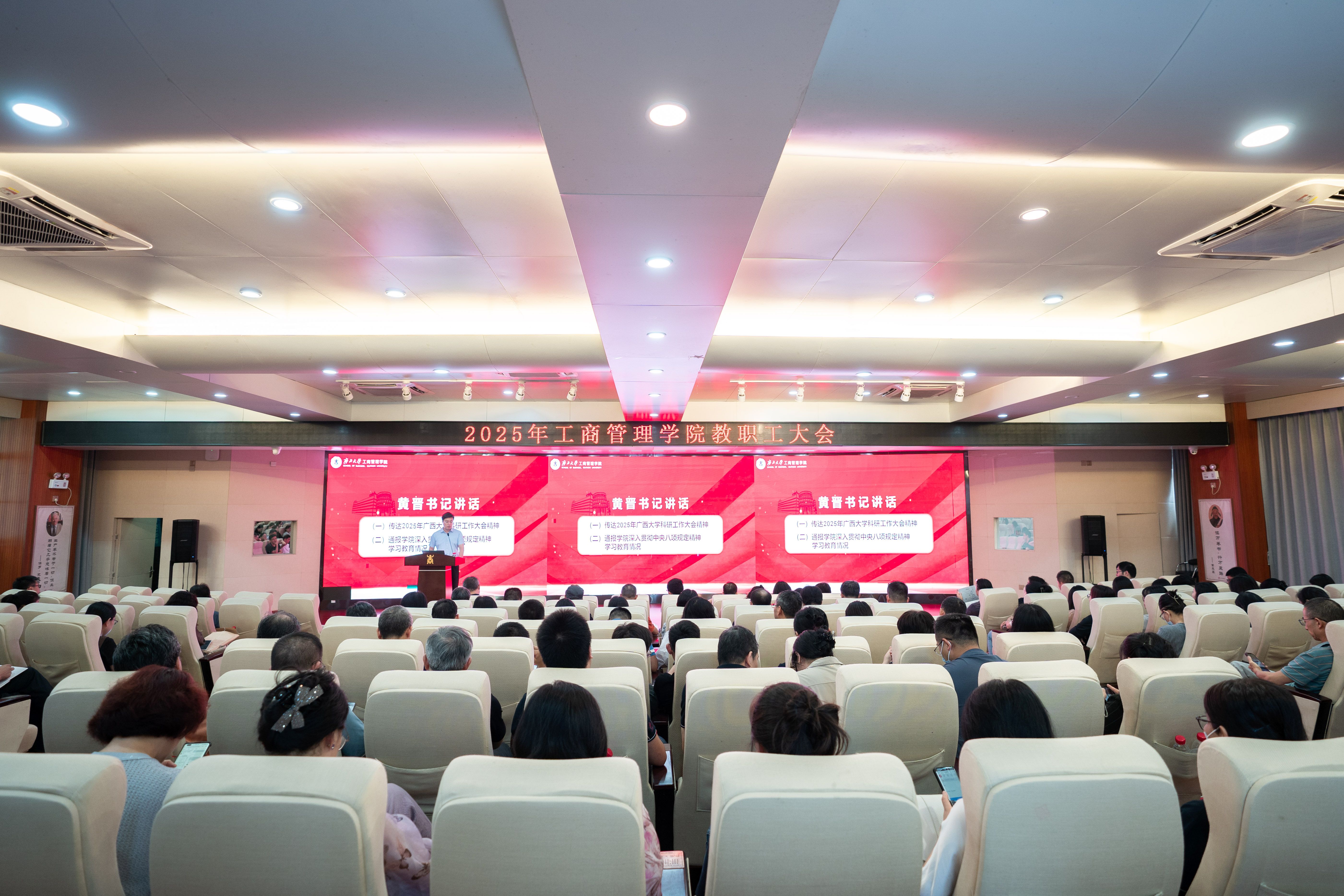 朱帮助就本学期工作进行总结讲话,他深入剖析了学院各系的现状、存在的问题以及未来的发展方向,明确了下一阶段重点任务。他指出,学院将紧扣学校新一轮“双一流”建设和“部区合建”战略部署,以有组织科研为抓手,全面启动科研团队和教学团队建设专项行动,根据学科发展方向调整学院基层教学组织和专任教师人员归属,通过优化管理机制、强化绩效分配、完善考核评价等举措,构建学科交叉、协同创新的团队模式,激发人才创新潜能,推动科研攻关与学科建设取得实效。同时,增设“创新与高质量发展系”,形成四系协同发展格局,促进“AI+双碳+东盟”特色的工商管理学科能力提升,更好地服务国家战略和东盟发展。