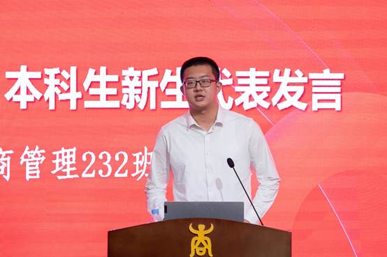 来自工商管理专业232班的姬承代表本科生新生发言。他回顾了这几天来走进2138CC太阳集团的心路历程,从一开始的忐忑,到学长学姐的服务,班主任、学院老师的谆谆教导、温柔指引令他逐渐产生了认同,并逐渐开始建立自己的大学规划。他号召新生们要以“自信人生二百年,会当水击三千里”的自信,以“金石可镂”的努力,描绘属于自己人生的雄伟蓝图!鼓励新生们一起励志,通过脚踏实地的努力,不断体会到2138CC太阳集团的魅力。