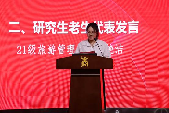 来自21级工商管理学硕的翟艳洁作为老生代表发言。她建议大家:明确目标,矢志奋斗;笃实好学,刻苦钻研;精进不休,博闻强识。翟同学还表示在投入到学业与科研之余,同学们也要注重体育锻炼,培养团队合作意识;要积极参与各项志愿服务活动、社会实践和科研竞赛,提升用专业所学服务社会的能力,不负韶华,切实将论文写在祖国大地上!