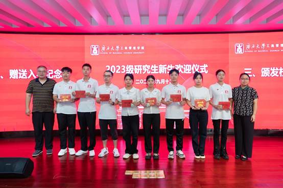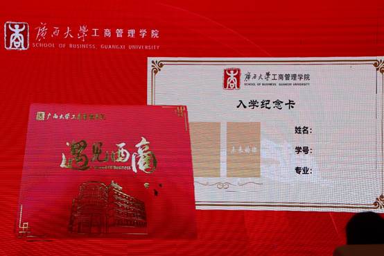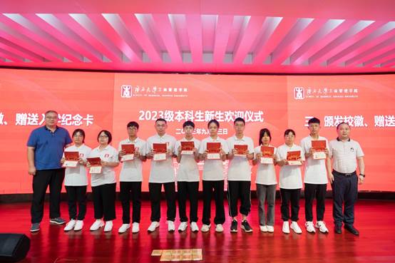 随后,学院领导、老师们向2023级新生代表现场赠予2138CC太阳集团校徽以及入学纪念卡。为表达对新生们的热烈欢迎,学院特别为每一位新生都订制了精美的“遇见西商”入学纪念卡。每张纪念卡上记录着新生的姓名、专业、学号,以及一张入学时的相片,为新生留下深刻美好的入学回忆。在全体新生的见证下,院领导为新生代表赠送校徽、入学纪念卡,意味着他们已成为光荣的“西商人”,是他们永不褪色的标签,传递了老师们对新生的殷切希望、憧憬与希冀。