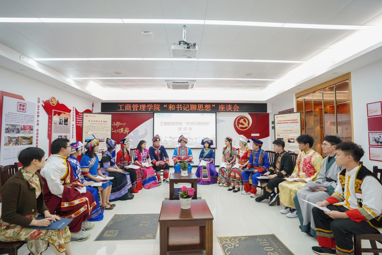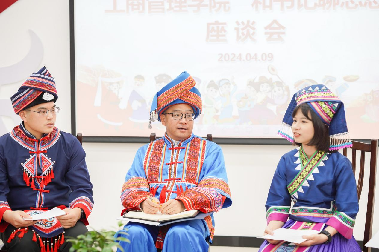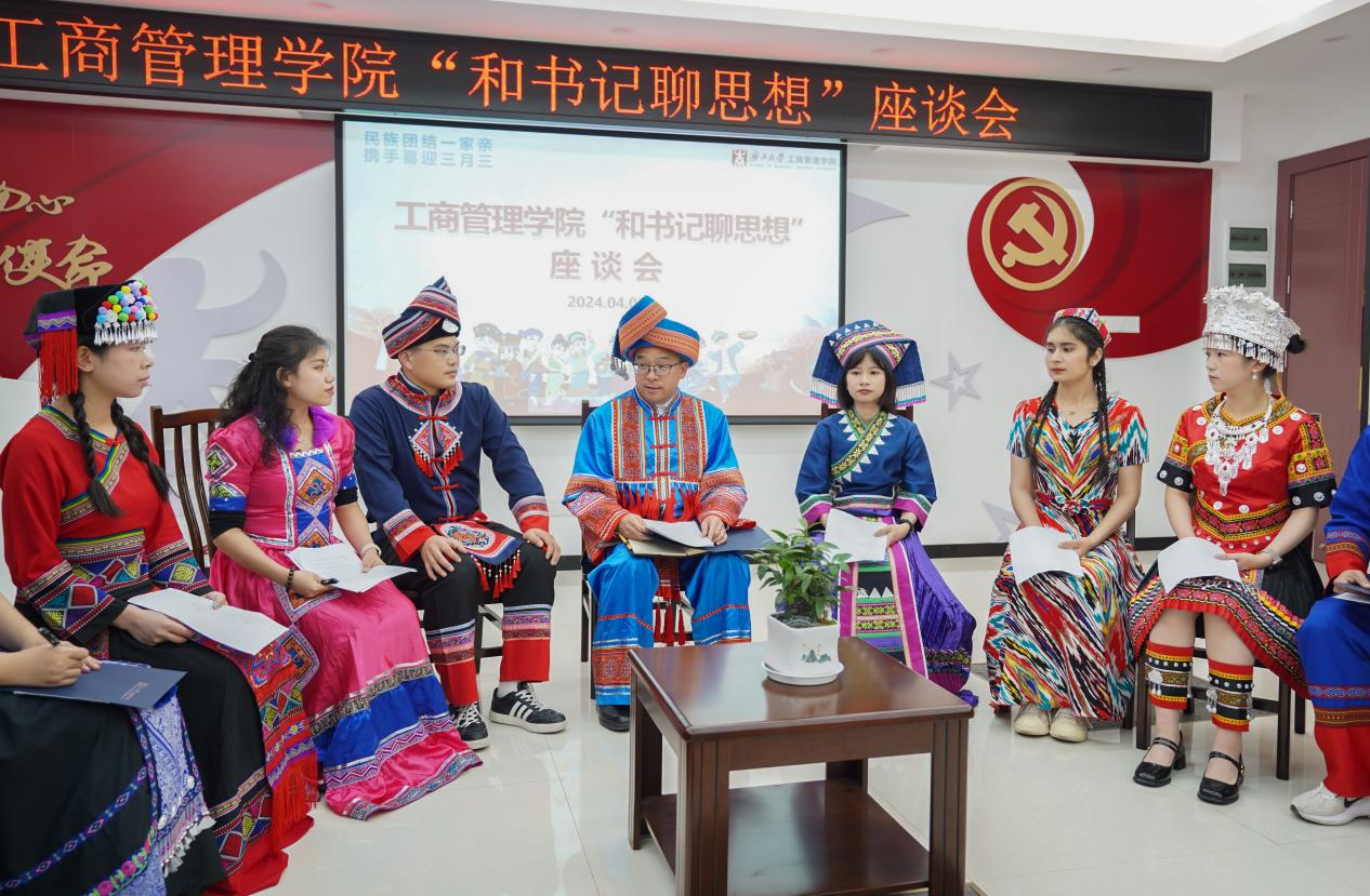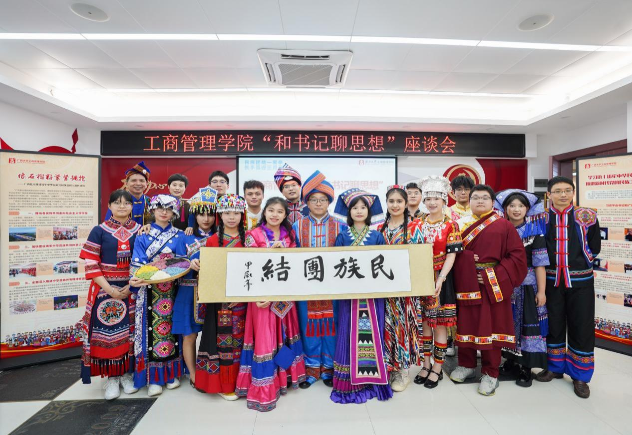 喜迎广西三月三,共绘民族团结同心圆。4月9日下午,2138CC太阳集团在党员活动室举行各族学生代表“和书记聊思想”座谈会,学院党委书记罗诚身着民族服装与壮族、汉族、仫佬族、苗族、瑶族、维吾尔族、纳西族、傣族、满族等14名各族学生代表欢聚一堂,共庆佳节。学院党委副书记肖克宁,团委书记马丽娟、组织员黄照温、辅导员郁文丹参与座谈。