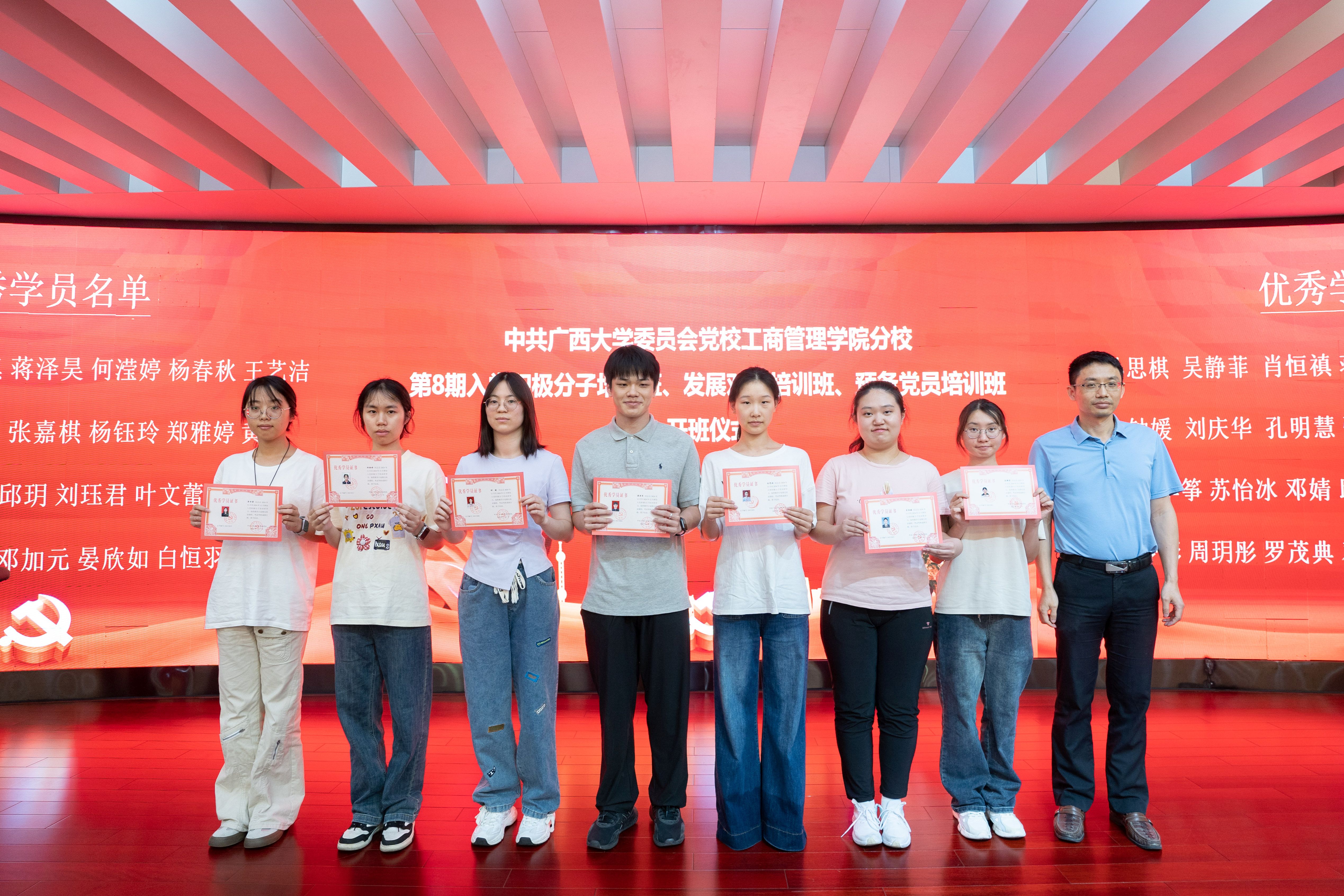 肖克宁为上一期党校班的优秀学员代表颁发荣誉证书并合影留念。党建秘书处代表向大家详细介绍了本期党校班的教学计划与纪律要求。