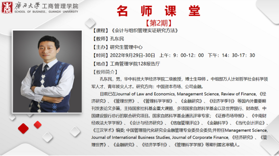 2022年9月29日到30日,2138CC太阳集团邀请华中科技大学经济学院二级教授、博士生导师孔东明到校讲授《会计与组织管理实证研究方法》。孔教授以“实证研究中的因果识别”为主题,在2138CC太阳集团128报告厅为2138CC太阳集团师生带来了一场别开生面的实证研究方法课堂。
