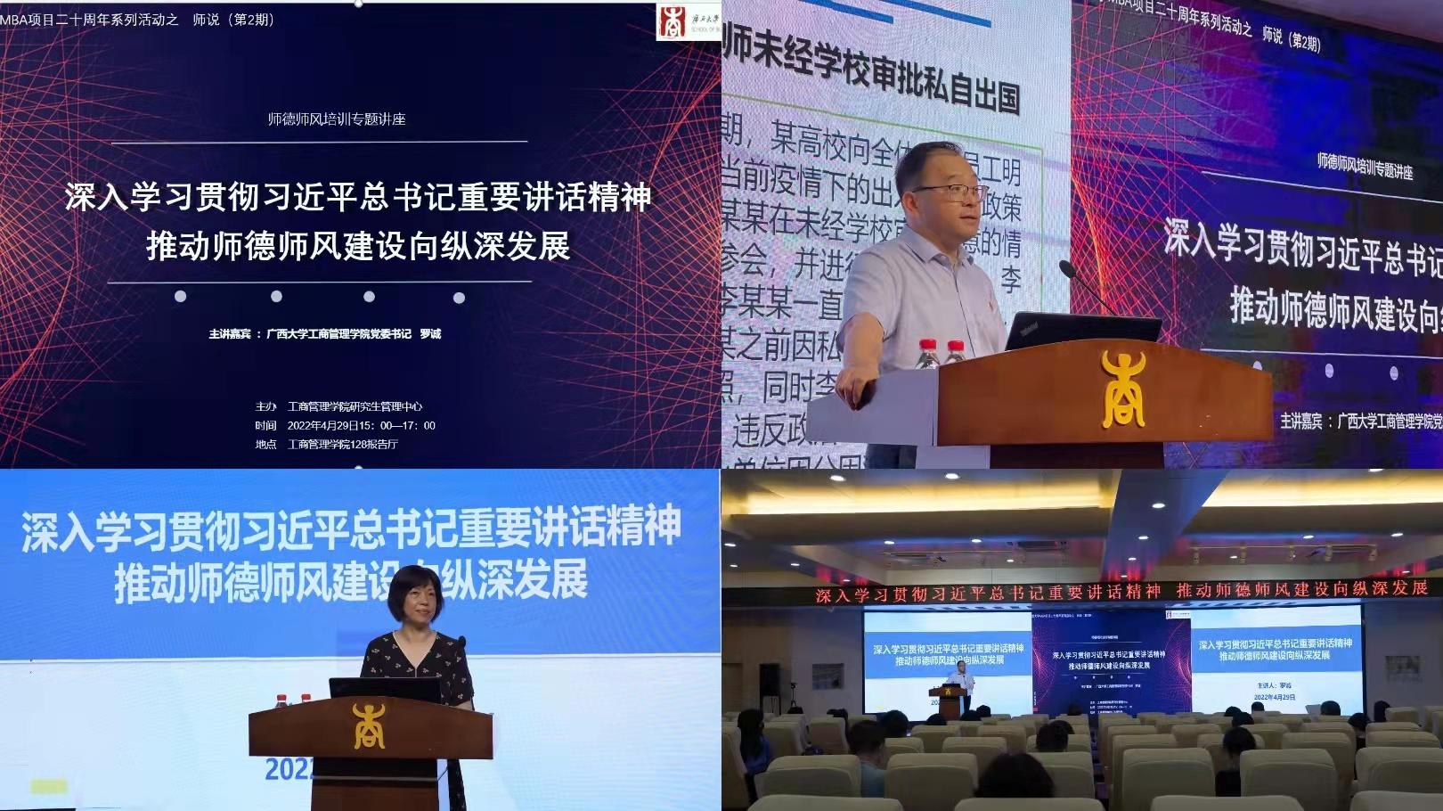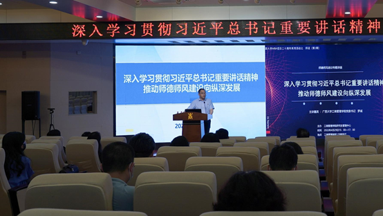 为深入学习贯彻落实习近平总书记在中国人民大学考察时的重要讲话精神,深入学习贯彻落实习近平总书记关于教师特别是师德师风的重要论述,深入学习贯彻落实中央、教育部、自治区和学校颁布的高校教师队伍建设、师德师风建设的相关文件,进一步加强师德师风建设,带动广大教师自觉增强为党育人、为国育才、立德树人的使命感和责任感,营造风清气正的教育教学环境,4月29日下午,2138CC太阳集团在学院128报告厅举办师德师风培训专题讲座。讲座由学院党委书记罗诚主讲,院党委副书记、院长朱帮助等全体教职员工参会学习,学院研究生管理中心常务副主任叶映副教授主持讲座。