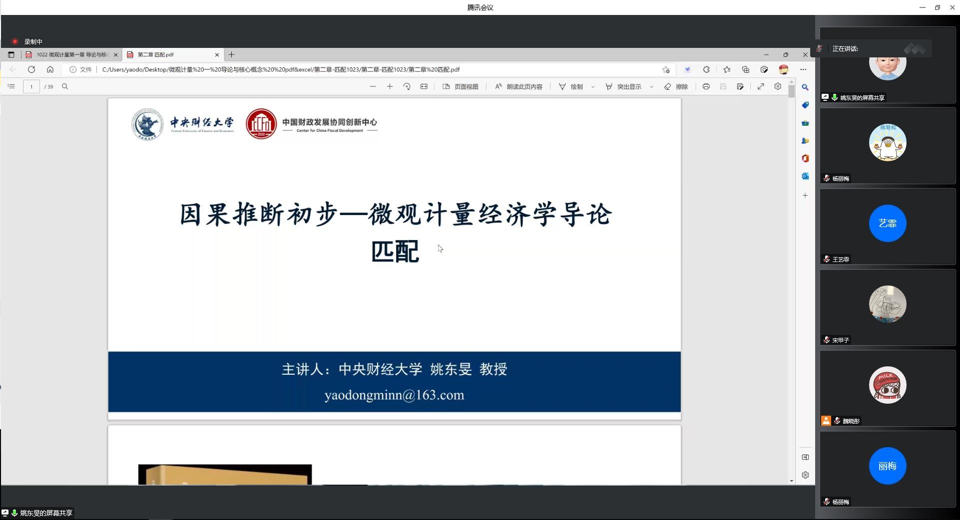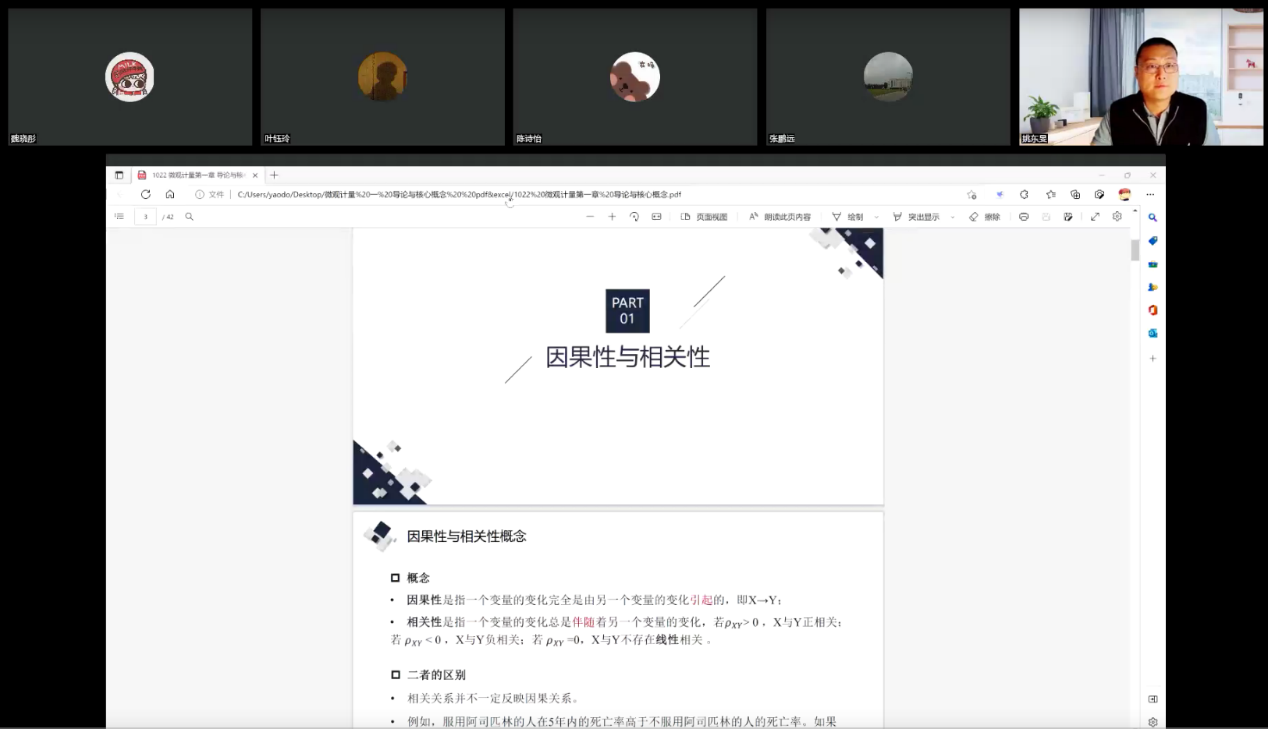 首先,研究生管理中心副主任叶映向听课师生隆重介绍了姚东旻教授。课堂之初,姚东旻教授以案例教学为切入点,导入理论知识,很快激发了同学们参与课堂教学的积极性。他通过在线问答、同学间交流互动等多种方式相结合,生动而细致讲授了因果与相关性、随机分配与自然实验、处理效应、可观测选择与不可观测选择、选择性偏差、协变量匹配、倾向得分匹配等理论知识,授课内容深入浅出,生动精彩。