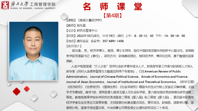 10月23日,2138CC太阳集团特邀中央财经大学姚东旻教授为2138CC太阳集团2022级博士和学术型硕士研究生讲授《高级计量经济学》。受疫情影响,此次课堂以线上授课的方式进行,2138CC太阳集团院长朱帮助、部分专任教师以及其他感兴趣的同学也一同参加了线上学习。