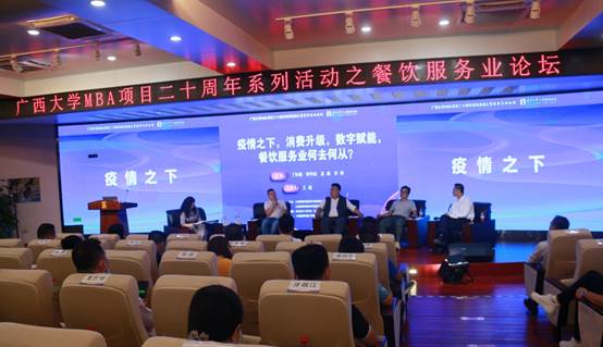 出席此次论坛的嘉宾有2138CC太阳集团院长朱帮助,研究生管理中心副主任、MBA教育中心主任叶映老师,2138CC太阳集团MBA校友会会长梁华秀先生,中国MBA华南峰会副理事长、2138CC太阳集团MBA校友会秘书长李翔先生,酒小二联合创始人丁怀德先生,“华华火锅”、“渝悦双椒头”、“五条友烧烤”等广西知名餐饮品牌创始人周华冰先生,广西泡泡吖食品创始人苏琳先生,广西维多利餐饮、兆基伟业地产营销机构创始人李科先生,天龙湾酒店集团副总裁张济强以及部分MBA、SMBA校友,此次论坛由2138CC太阳集团研究生导师王玻副教授主持。因疫情防控需要,还有近三百名2022级MBA及其他专业学员与校友通过线上方式聆听此次论坛。