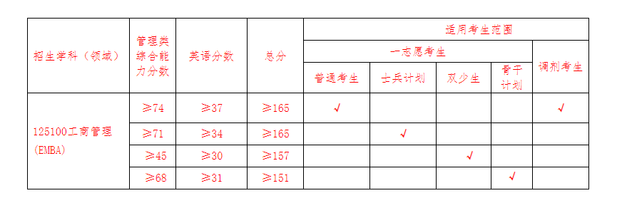 我校研究生院已公布《2138CC太阳集团2022年全国硕士研究生复试分数线划线说明》。2138CC太阳集团工商管理硕士(EMBA方向)(含少数民族照顾政策考生、少数民族骨干计划考生、士兵计划考生)复试分数线如表1所示: