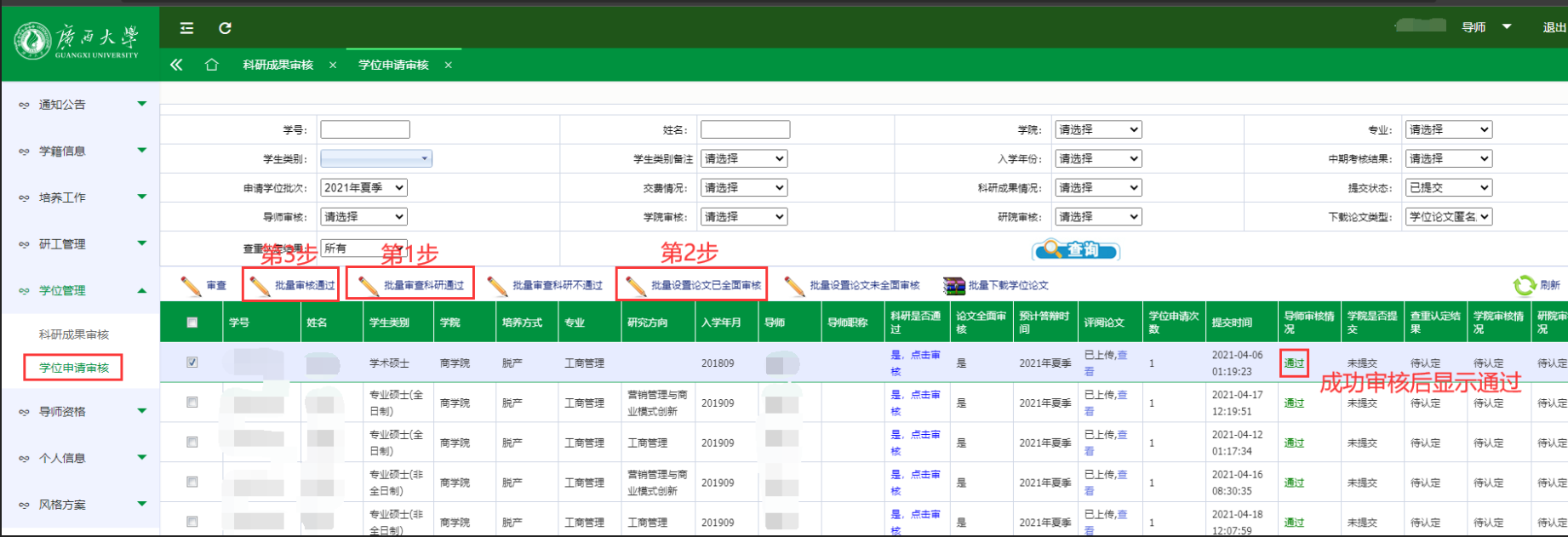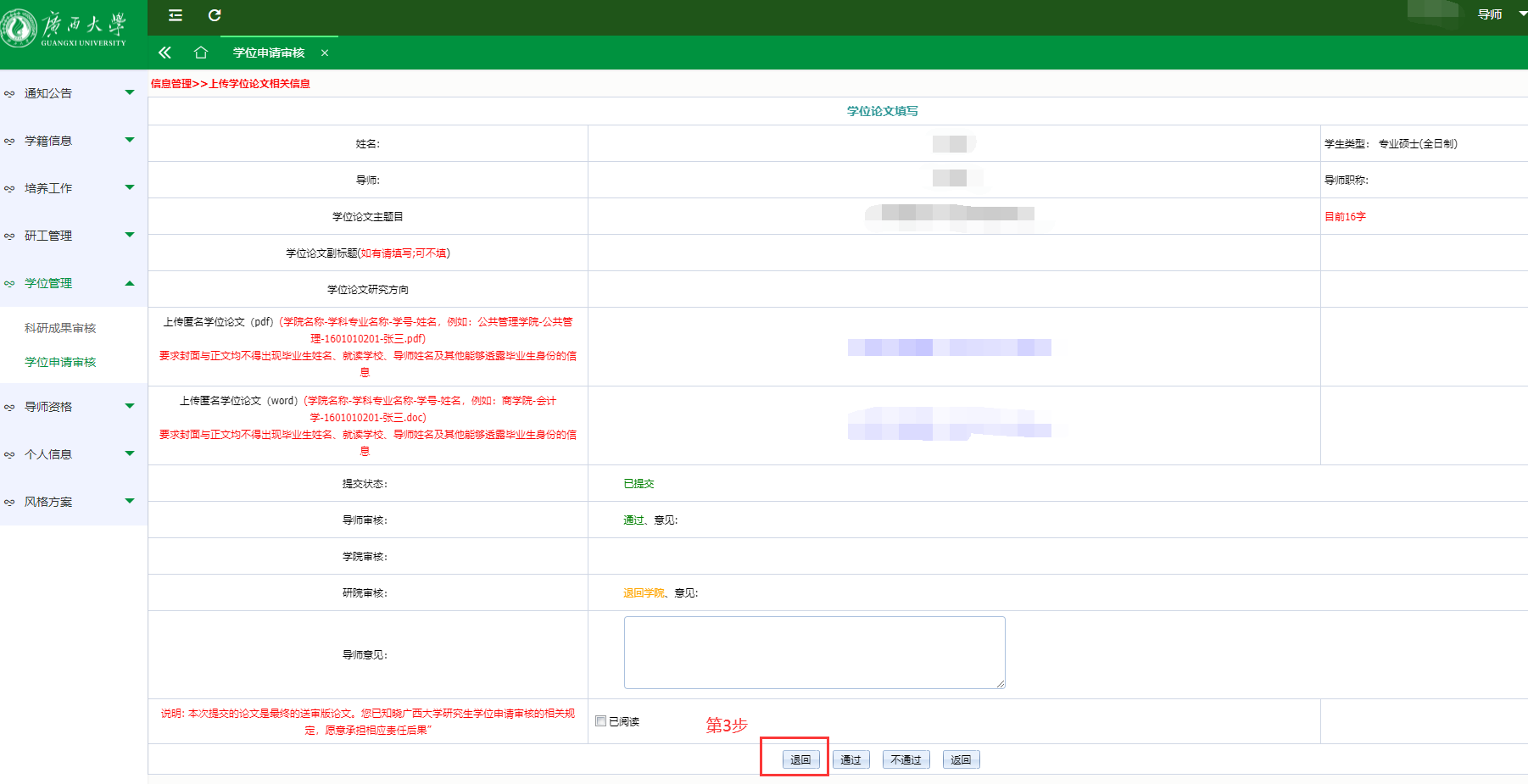 (4)请自行联系导师在10月30日16:00前登录系统完成审核。导师审核和退回操作步骤如图,必须按步骤依次审核,否则将审核不成功(可将操作步骤发给导师)。