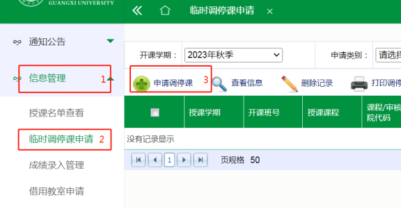 (一)任课教师必须在研究生综合管理信息系统上办理调停课申请,切换到教职工角色,具体操作流程如下:1信息管理—2临时调停课申请—3申请调停课。任课教师在系统中提交申请后,由开课单位和研究生院在系统上审批确认。