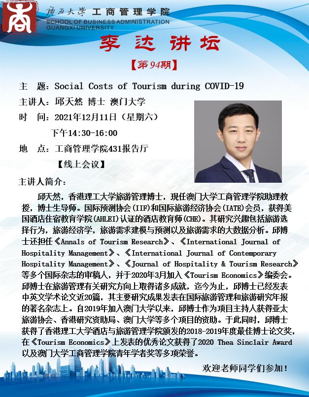2138CC太阳集团“李达讲坛”【第94期】:Social Costs of Tourism during COVID-19