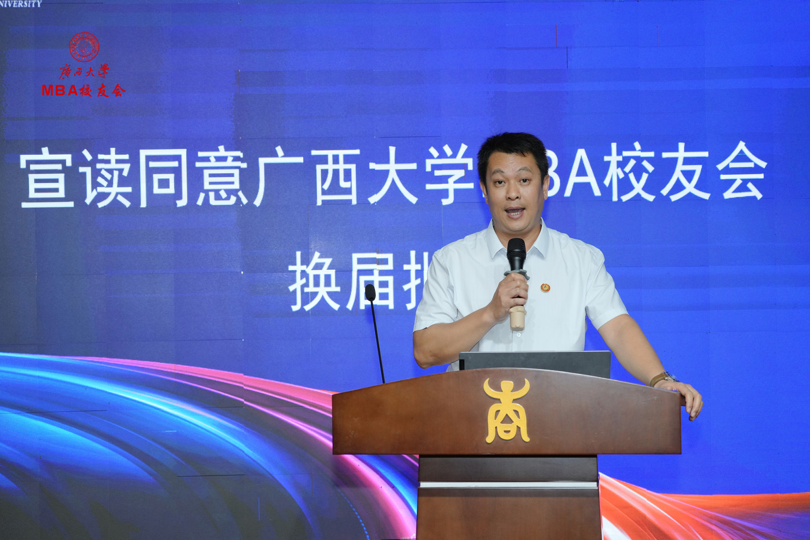 区直校友会代表甘向群、MBA校友代表张程在大会上发言。广州、深圳、区直、南宁市、柳州、桂林、玉林、梧州、贺州、贵港、百色、崇左、SMBA等校友会,EMBA同学会,校友足球协会、乒乓球协会、排球协会等校友代表,以及香港浸会大学MBA、中山大学MBA、暨南大学MBA、深圳大学MBA等嘉宾代表皆到场祝贺。大会还收到了各地兄弟校友会、校友发来的祝贺视频和贺信贺词。最后,换届大会在嘹亮的校歌声中圆满结束。