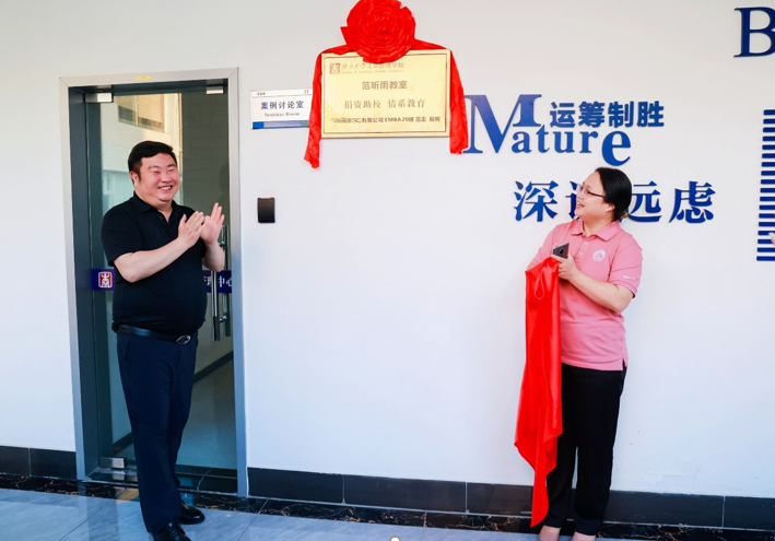 捐赠仪式结束后,朱少英副院长与范雷校友在所冠名的504案例室外举行了揭牌仪式。下一阶段,学院将进一步加强与各界校友的联系与合作,更好地凝聚校友力量,增进校友与母校间的情感,实现学院和校友事业共赢发展。