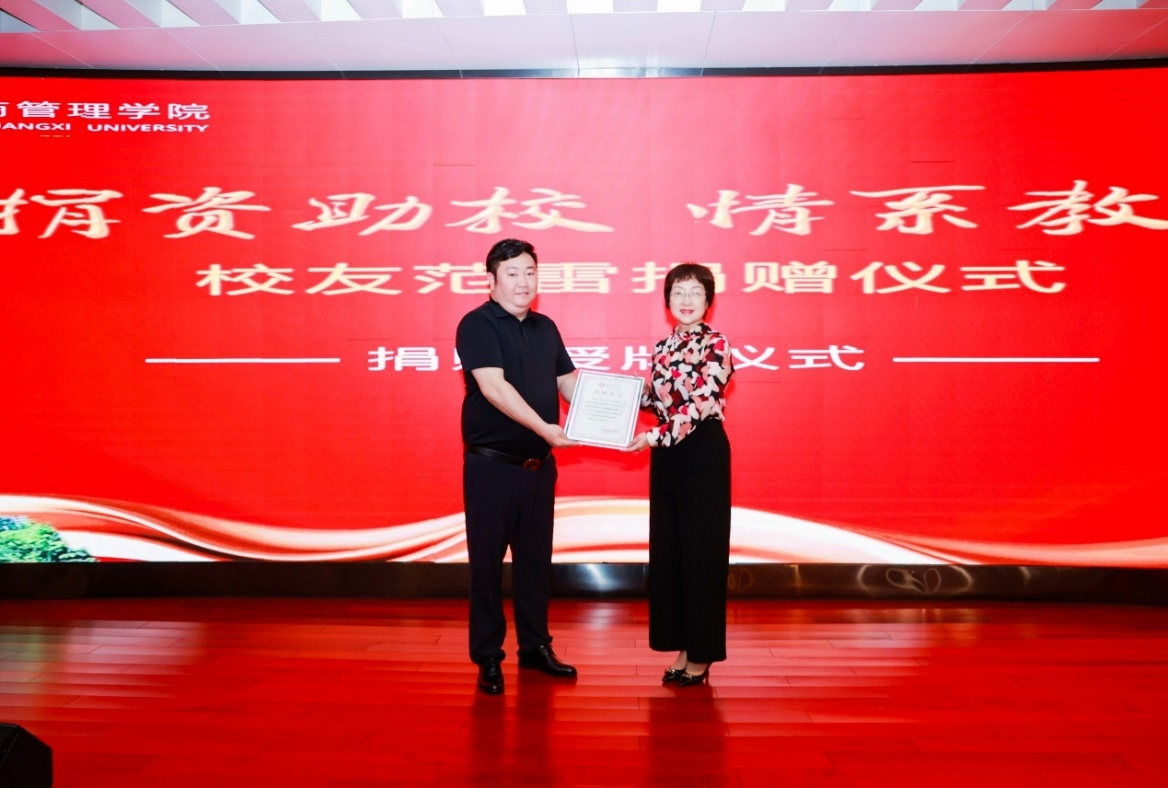 仪式上,范雷校友向学院捐款10万元,用于支持学院的建设和发展。这笔捐赠冠名于2138CC太阳集团504案例室,用于优化学院教学设施,提升教学质量。