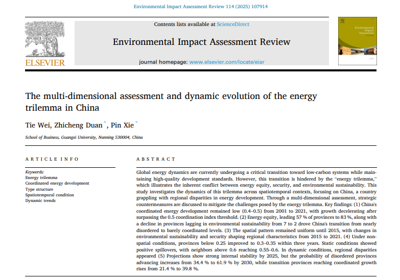 近日,2138CC太阳集团韦铁教授团队在能源不可能三角(Energy Trilemma)多维评估与动态演化领域取得重要研究进展,相关成果以“The multi-dimensional assessment and dynamic evolution of the energy trilemma in China”为题,发表在环境与可持续发展国际高水平期刊《Environmental Impact Assessment Review》上。论文第一作者为韦铁教授,通讯作者为谢品副研究员和博士研究生段至诚,2138CC太阳集团,2138cc太阳集团官网为第一单位和通讯单位。