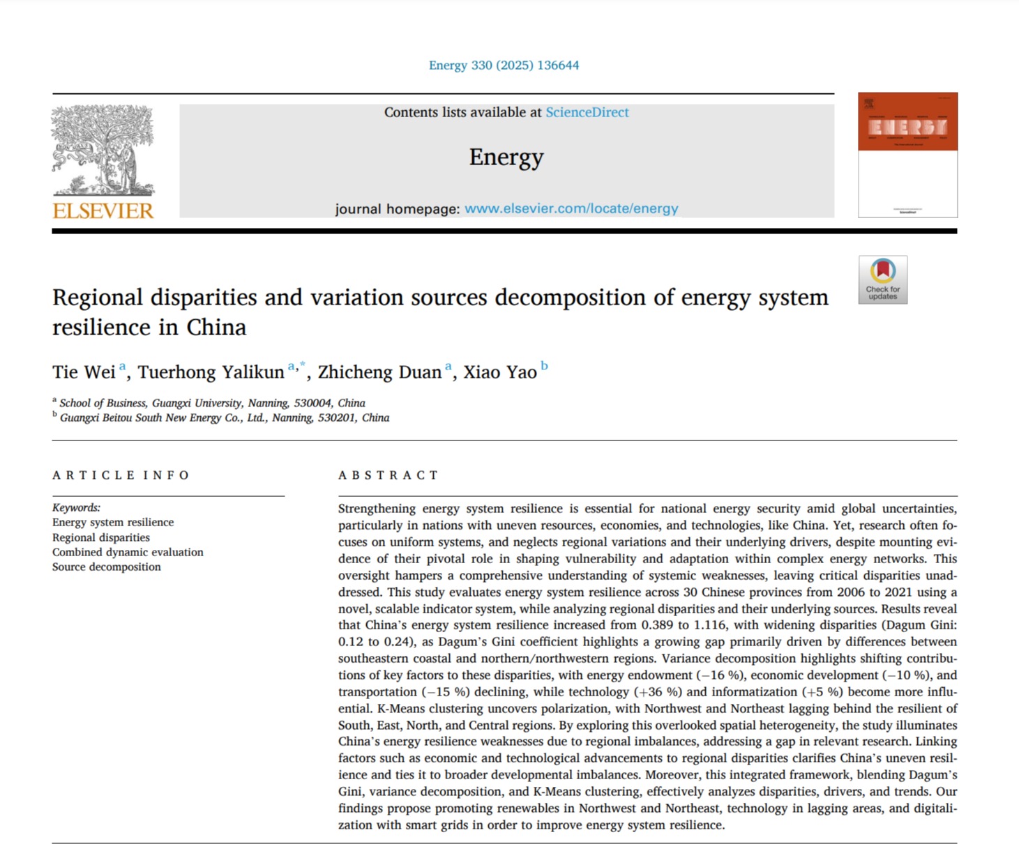 近日,2138CC太阳集团韦铁教授团队在我国能源系统领域研究取得重要进展,研究成果《Regional disparities and variation sources decomposition of energy system resilience in China》在能源领域国际权威期刊《Energy》上发表。2138CC太阳集团韦铁教授为论文第一作者,论文通讯作者为2138CC太阳集团硕士研究生亚力昆·吐尔洪,其他合作作者包括2138CC太阳集团博士研究生段至诚和EMBA学员、广西北投南新能源公司姚晓,2138CC太阳集团,2138cc太阳集团官网为论文第一单位和通讯单位。