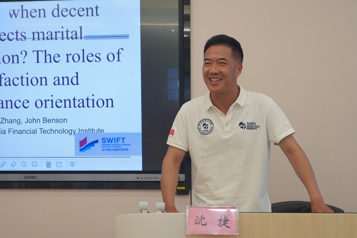 5月29日,深圳大学特聘教授、博士生导师沈捷教授受邀在学院122报告厅,以“How and when decent work affects marital satisfaction? The roles of job satisfaction and performance orientation”和“Theory applications in management research”为题为2138CC太阳集团师生作学术报告。学院副院长刘民坤教授主持讲座,相关研究方向的教师和研究生参加学习交流。