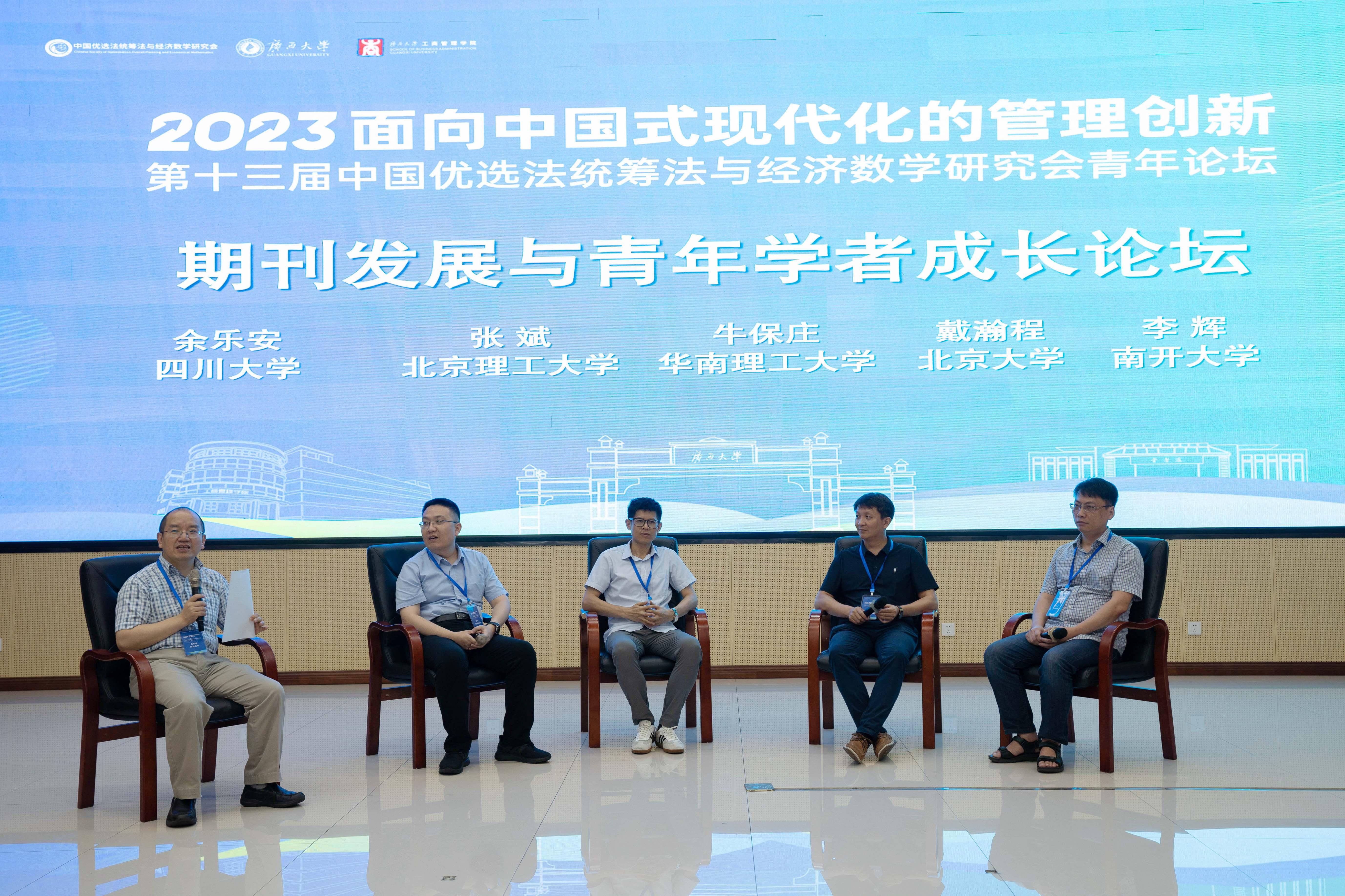在期刊发展与青年学者成长论坛环节,在四川大学余乐安教授的主持下,北京理工大学张斌教授、华南理工大学牛保庄教授、北京大学戴瀚程副教授、南开大学李辉教授就海归学者与本土学者面临的机遇和挑战、青年学者如何做好科研工作、做好时间统筹管理、找准核心竞争力,如何更好地将科研与教学相融合、更好的服务社会等青年学者关心的热点问题进行了一一解答,并结合自身经历分享了相关经验,提出了建议。