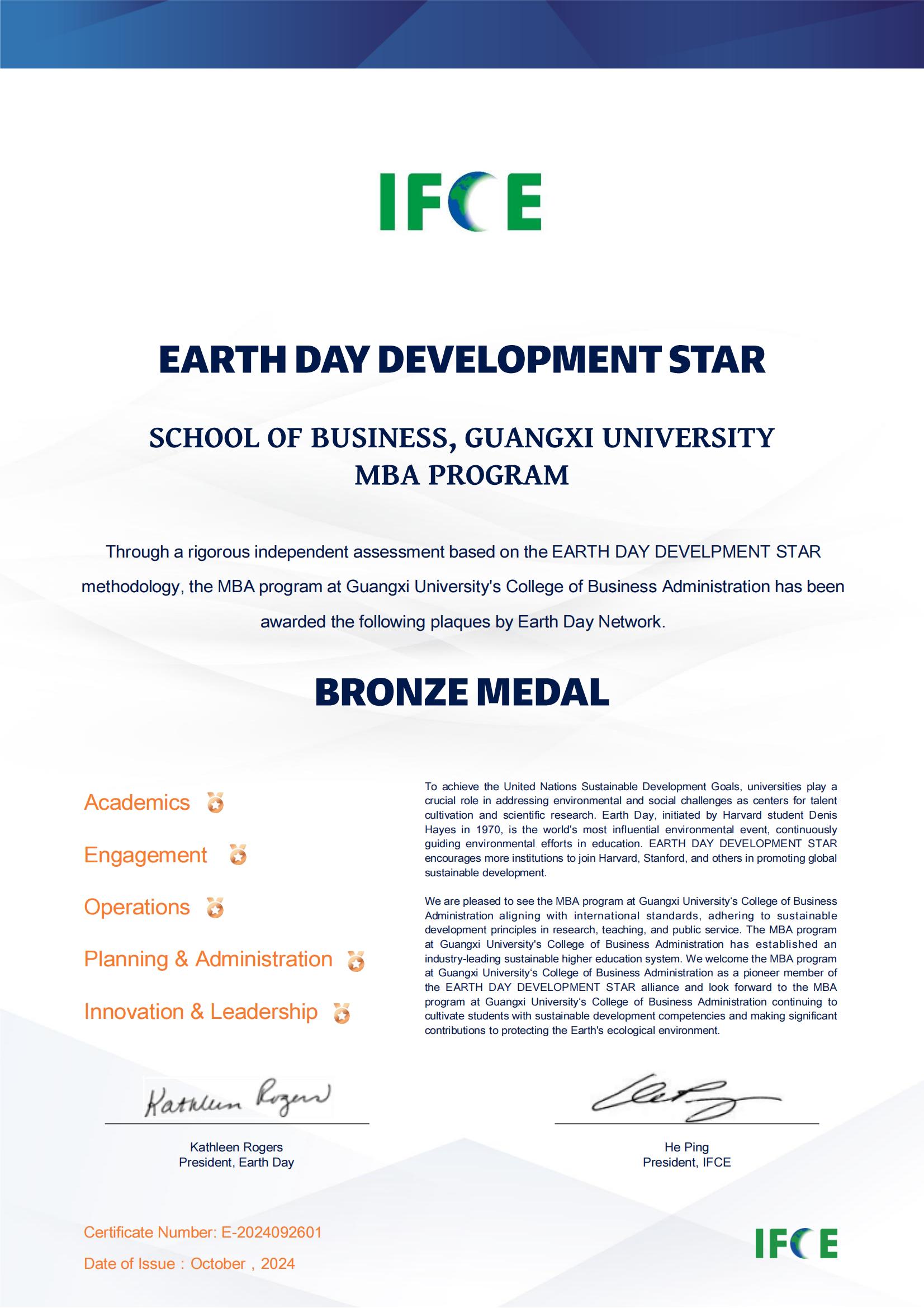 2024年10月2138CC太阳集团MBA项目获得EARTH DAY DEVELOPMENT STAR铜牌认证,表明该项目在ESG和可持续发展领域得到了国际认可。